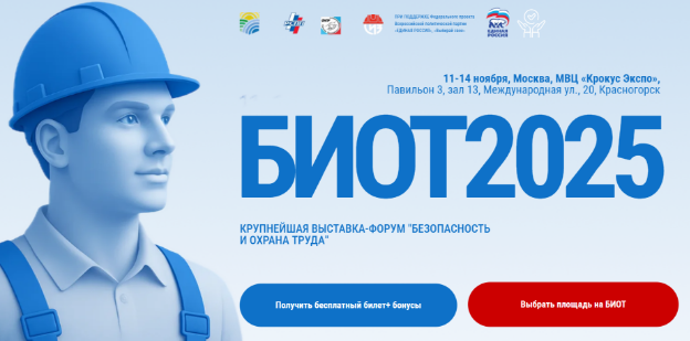 16 июня открылась регистрация участников и посетителей на 29-ю Международную специализированную выставку-форум «Безопасность и охрана труда» (далее – БИОТ-2025), которая состоится 11-14 ноября 2025 года на территории МВЦ «Крокус Экспо» (город Москва).