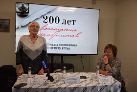 Краевед рассказала о том, когда приехали, где жили и чем занимались декабристы Иван Федорович Фохт, Владимир Николаевич Лихарев, который часто ездил в Тобольск лечиться. О Михаиле Александровиче Назимове, по проектам которого строились дома горожан, и о Петре Николаевиче Свистунове, который женился в Кургане и принадлежал к младшему поколению декабристов. Слушатели встречи узнали редкие факты из жизни декабристов в Кургане - об Андрее Евгеньевиче Розене и Флегонте Мироновиче Башмакове, и других. Также на встрече были рассмотрены вопросы проведения мероприятий к юбилею восстания декабристов, о проекте «Поваренная книга декабристов».
