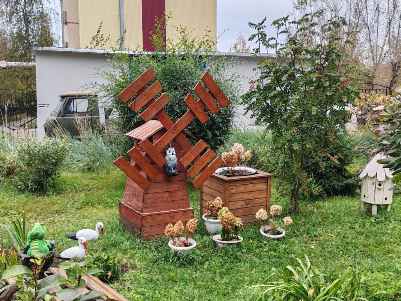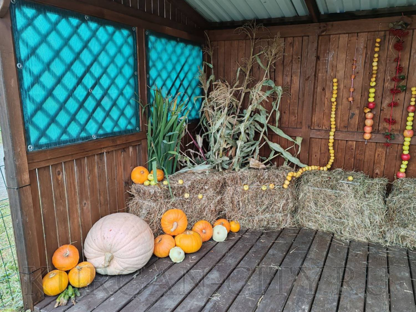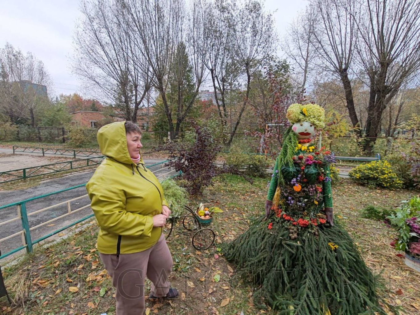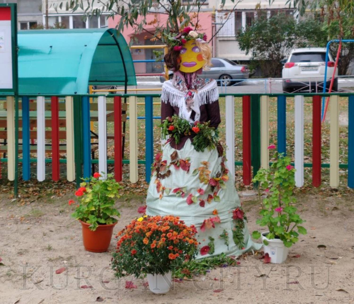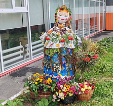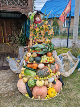 В ТОС «Заозёрный-7» жители свою ростовую куклу изготовили из прочного металлического каркаса, одели её в осенний наряд декорированный листьями.