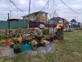 Удивил конкурсную комиссию ТОС «Радужный поселок» и их «Королева Осени». Кукла располагается на территории детской площадки микрорайона Радужный, имеет оригинальную трёхъярусную юбку, изготовленную из кругов фанеры и декорированную тыквой, яблоками, кабачками, арбузом и др. На веранде жители подготовили осеннюю фотозону, её декор выполнен из сена, тыкв и других природных материалов. Также жители ТОС «Радужный поселок» на территории детской площадки обустроили декоративный водоем, установили мостик с черепашкой, а для отдыха приобрели два кресла-кокона на подставке.