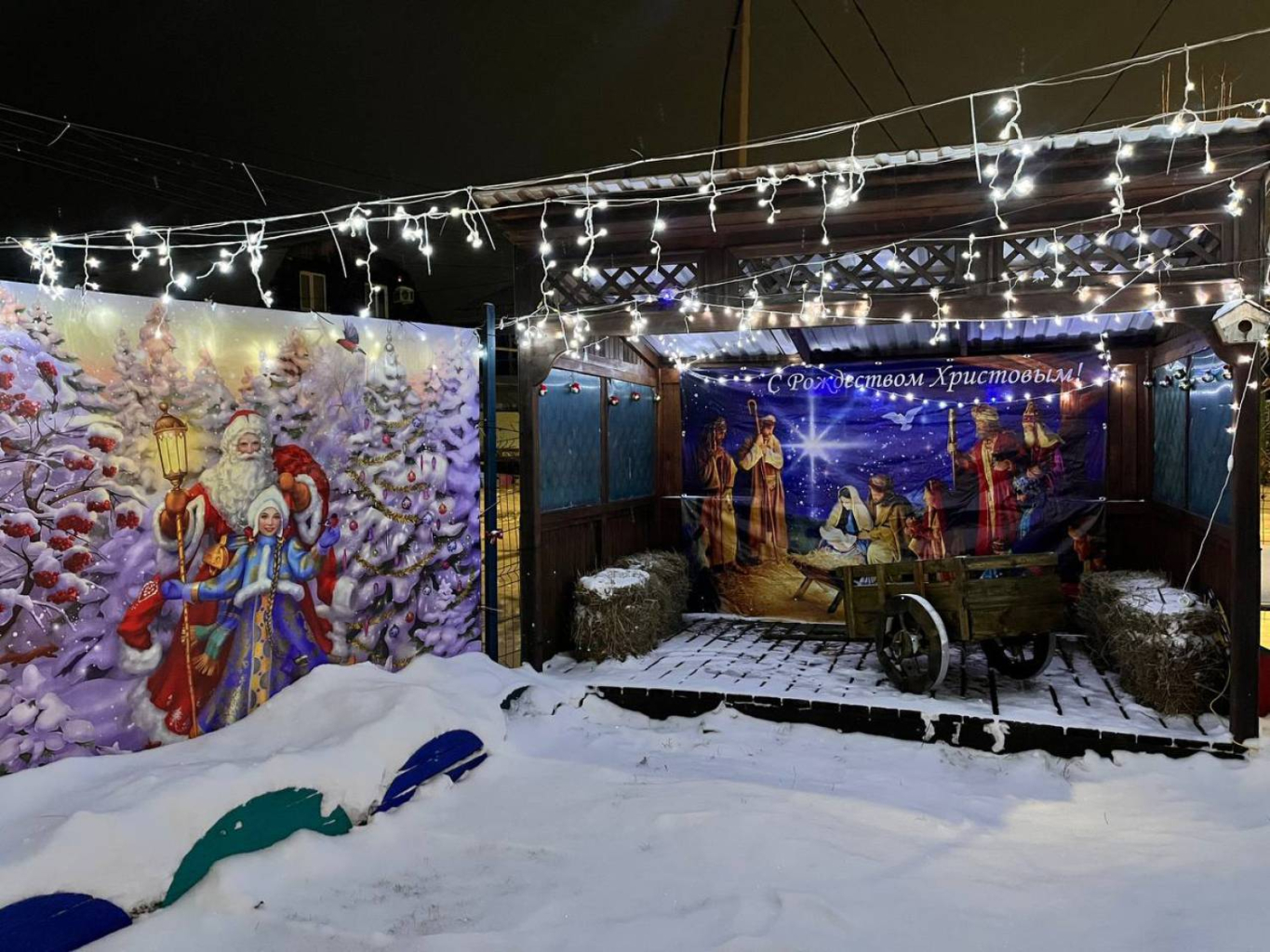 ТОС «Радужный поселок» ежегодно украшает рождественский вертеп, имитируя пещеру, с помощью еловых веток, гирлянд и персонажей. Горожане придумывают каждый год новые композиции для украшения. В этот раз уже появились купель, люлька, неподалеку расположилась фотозона.