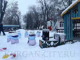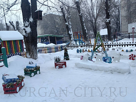 Особый интерес вызвал у комиссии детский сад № 5 «Солнечный», расположенный по проспекту Конституции, 71А. Вся территория детского сада оформлена в новогоднем стиле, соответствуя скорому празднику. Помимо оформленных флажками, мишурой, шарами и открытками беседок, веранд и горок, гостей приветствовали веселые разноцветные снеговики, а также персонажи известных сказок — Серебряное копытце и Щелкунчик.