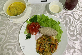 На конкурсе Оксана Шишко представила куриный суп, овощное рагу с сарделькой паровой, сметанный соус и клюквенный морс.