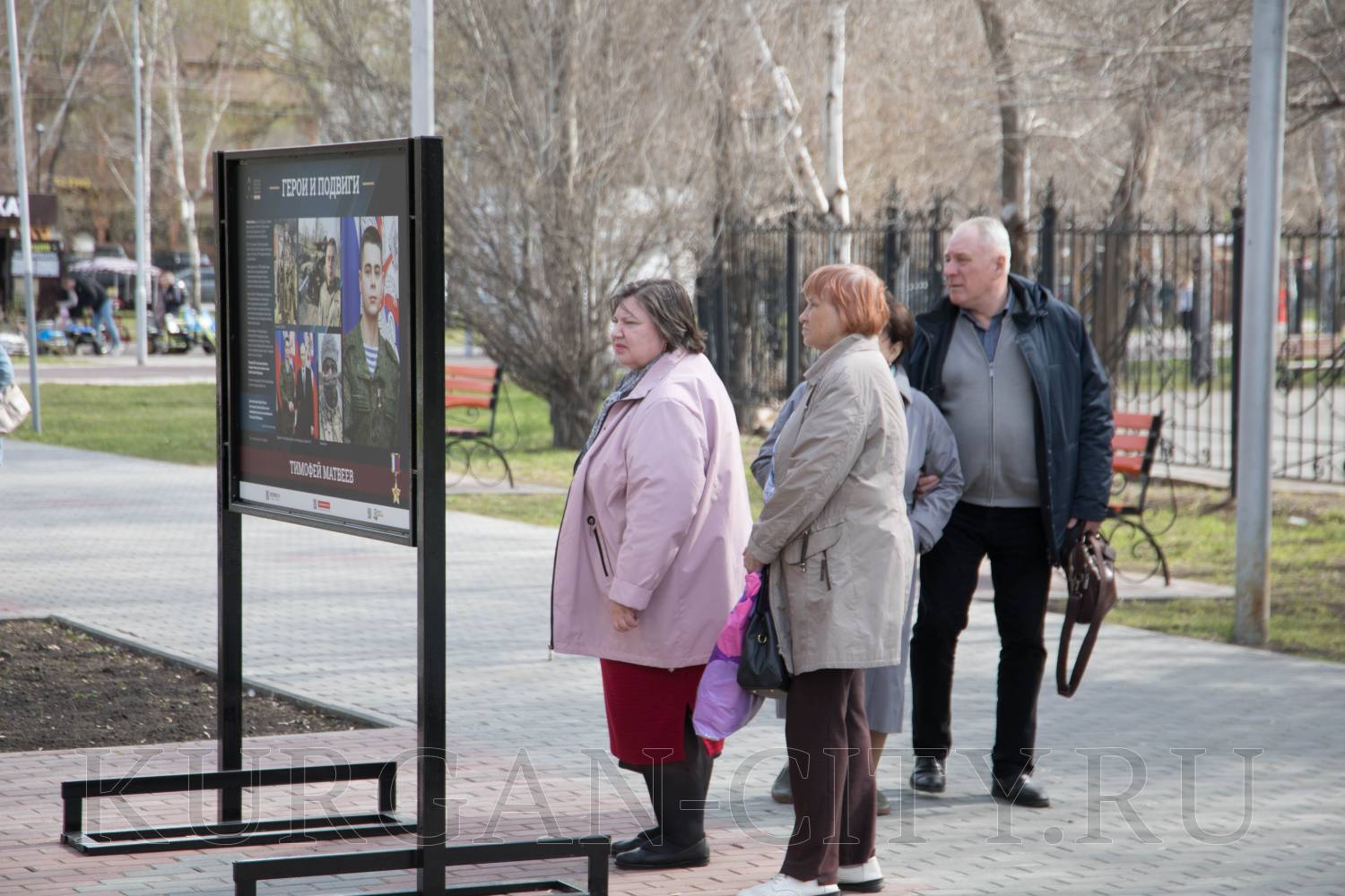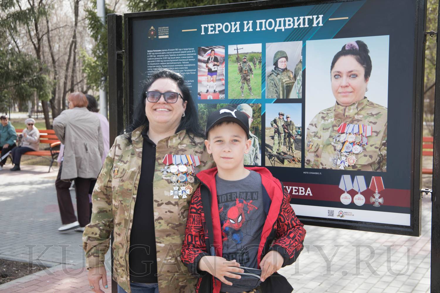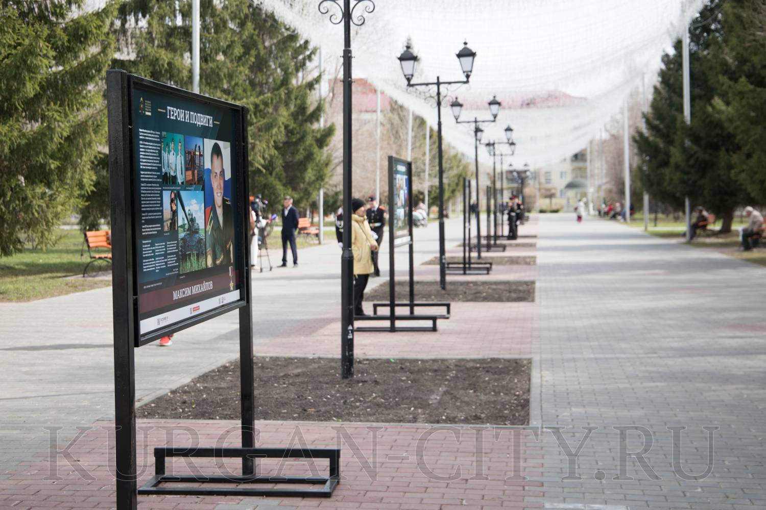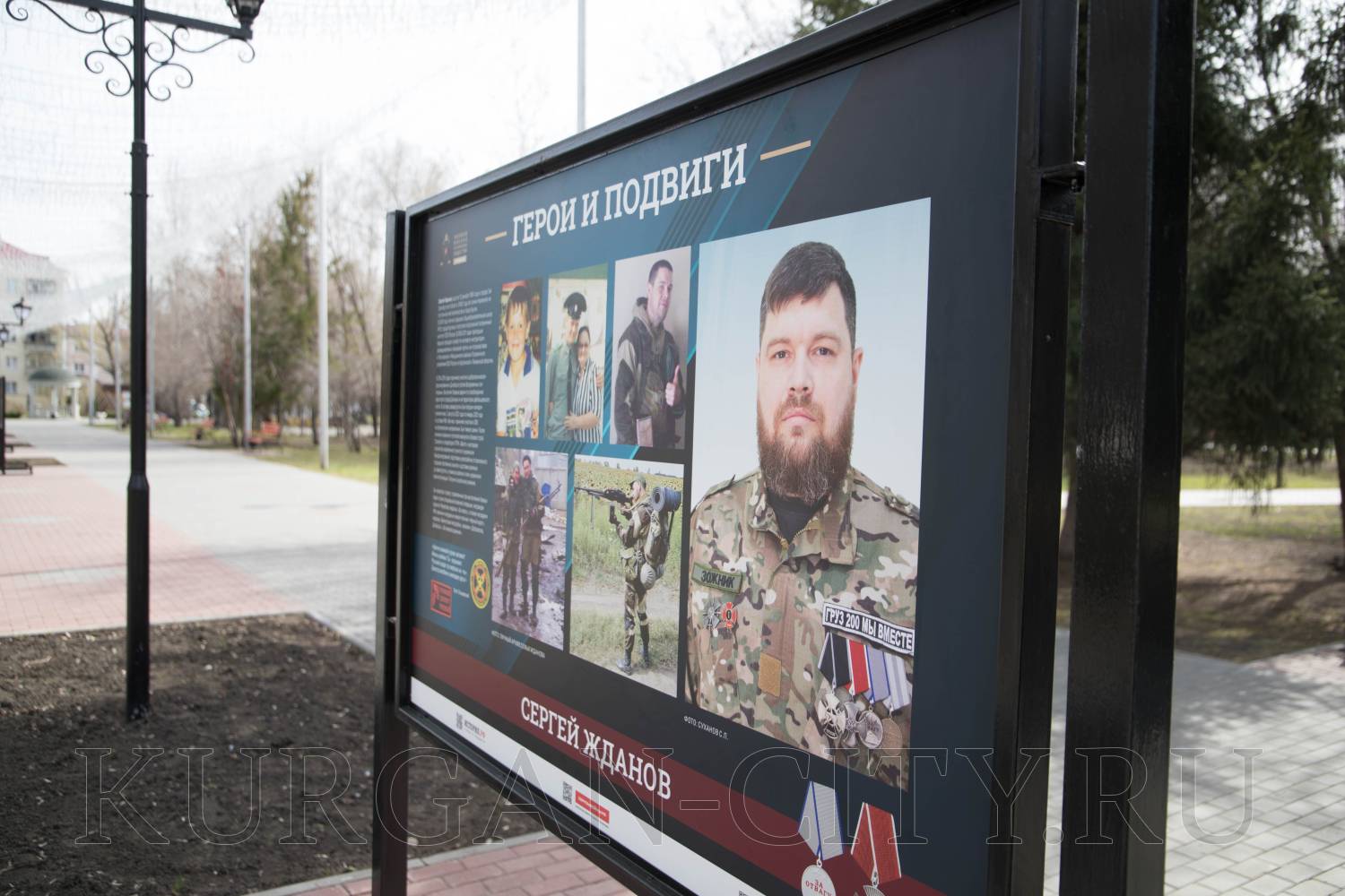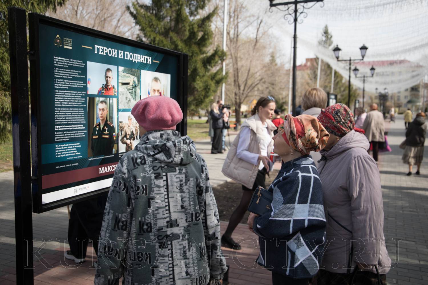 Экспозиция «Герои и подвиги» разместилась на 20 стендах и посвящена современным героям, таким, как пехотинцы Александр Матросов и Юрий Смирнов, летчики Николай Гастелло и Виктор Талалихин, политрук Клочков и снайпер Зайцев, разведчик Николай Анфиногенов и собровец Евгений Родькин. Экспозиция отражает истории жизни и подвига участников специальной военной операции, в числе которых жители города Кургана и Курганской области. Среди них уроженец села Актабан Петуховского округа Жумабай Раизов, ставший первым Героем Российской Федерации из Зауралья в период СВО.