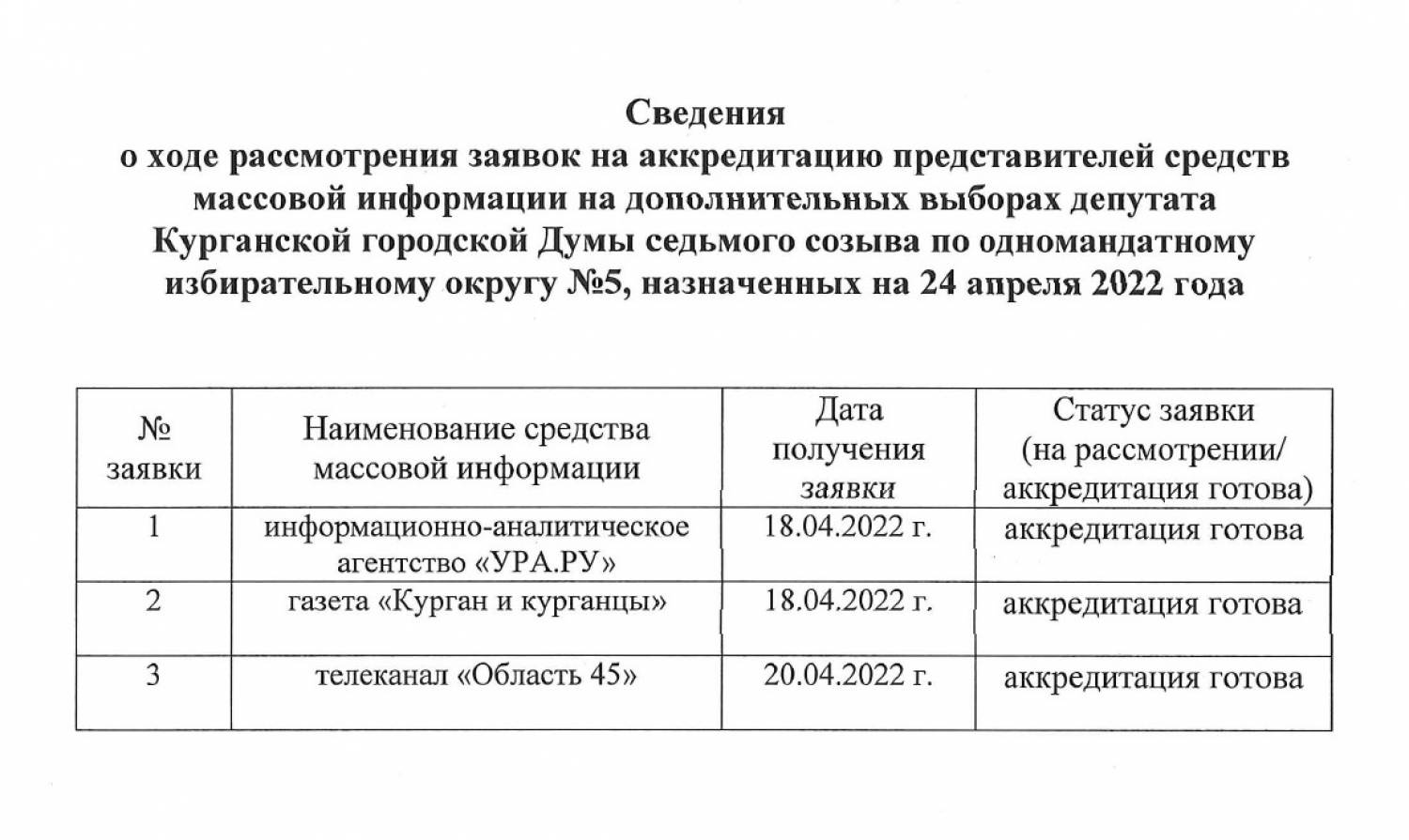 В Западной ТИК города Кургана аккредитация представителей средств массовой информации для информационного освещения хода, итогов голосования и результатов дополнительных выборов депутата Курганской городской Думы седьмого созыва по одномандатному избирательному округу №5 начинается с 3 апреля 2022 года. Заявки на аккредитацию принимаются по 20 апреля 2022 года.