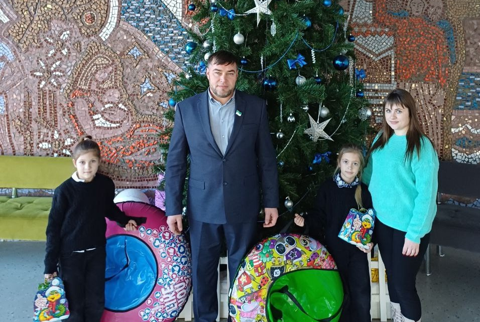 На празднике Александр Маклыгин встретился с сестрёнками Ариной и Вероникой, которые мечтали о тюбингах, и подарил девочкам желанные подарки.