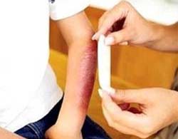 ОжогиОжогом называется повреждение живых тканей, вызванное воздействием высокой температуры, химическими веществами, электрической или лучистой энергией. В зависимости от поражающего фактора различают термические, химические, электрические и лучевые ожоги. В быту и в чрезвычайных ситуациях наиболее часто встречаются термические ожоги. Они возникают от воздействия пламени, пара, расплавленного металла, горячей жидкости, от контакта с сильно нагретым предметом. Особенно опасны для жизни ожоги кожных покровов, сочетающиеся с ожогами слизистых оболочек верхних дыхательных путей. Что часто происходит при пожаре в закрытом помещении. Иногда такие ожоги сопровождаются отравлением окисью углерода. Химические ожоги происходят от действия концентрированных кисло, едких щелочей и других химических веществ. Особо опасными являются ожоги слизистой оболочки рта, пищевода и желудка, вследствие случайного или ошибочного употребления таких веществ. Электрические ожоги возникают при действии электрического тока или молнии. При этом разрушению могут подвергнуться не только наружные, но и глубоко расположенные ткани, кровеносные сосуды и нервы. Наиболее часто встречающиеся лучевые ожоги бывают от солнца. Тяжесть состояния пострадавшего зависит от глубины, площади и места расположения ожога. По степени тяжести ожоги классифицируются по четырем степеням: первой, второй, третьей и четвертой (см. Приложение). Состояние пострадавшего зависит также от обширности ожогов. При площади ожога свыше 10-15% поверхности тела (у детей до 10%) развивается так называемая ожоговая болезнь. Пострадавшие в таком состоянии мечутся от боли, стремятся убежать, плохо ориентируются в месте нахождения и обстановке. Площадь ладони составляет около 1% площади поверхности тела человека. Правила оказания помощи при термических ожогах При оказании помощи в первую очередь нужно принять меры для быстрейшего прекращения воздействия высокой температуры или другого поражающего фактора. При ожогах кистей рук необходимо как можно раньше снять с пальцев кольца, так как в последующем это сделать будет крайне трудно из-за отека. Для уменьшения боли обожженное место полезно в течение нескольких минут орошать струей Запрещается производить какие-либо манипуляции на ожоговой поверхности: накладывать повязки с мазями и жирами, применять соду, крахмал, мыло, сырые яйца. Эти средства, помимо загрязнения пораженного участка, вызывают образование трудно снимаемой с ожоговой поверхности пленки. Правила оказания помощи при химических ожогах При химических ожогах после снятия одежды следует в течение не менее 15-20 минут обмывать При ожоге кислотой на пораженную поверхность накладывают повязку, пропитанную 5% раствором питьевой соды, а при ожоге щелочью – пропитанную слабым раствором лимонной, борной или уксусной кислоты. Для уменьшения болей пострадавшему можно дать обезболивающее средство (анальгин, пенталгин, седалгин и др.). При обширных ожогах, кроме того дать 2-3 таблетки аспирина и одну таблетку димедрола или пипольфена. По возможности напоить горячим чаем, кофе или щелочной минеральной водой. |
