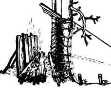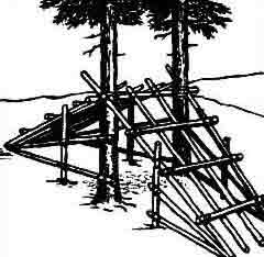 Двускатные шалаши строятся, на двух близко стоящих деревьях, или кольях высотой в 1,5 -1,7 метра. Односкатные укрытия строятся в холодную осеннюю погоду. Перед односкатным укрытием можно устроить костёр с отражателем. Отражатель можно сделать из брёвен, коры деревьев. Благодаря отражателю тепло будет идти непосредственно в укрытие. |