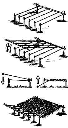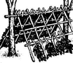Для этого вбейте в землю 4 коротких колышка с развилками на концах и положите на них две продольные и две поперечные слеги. Для прочности слеги можно привязать к колышкам верёвкой. На эту раму положите ещё несколько поперечных палок, привязав их концы к продольным слегам. Теперь наломайте зелёных веток (лучше всего, если по близости есть заросли хвойных деревьев) и покройте ими всю кровать ветки нужно класть плотными рядами так, чтобы толстый, нижний конец веток был прикрыт верхушками следующего ряда (как кроют крышу черепицей). Промежутки между ветками можно засыпать хвоей или заложить мхом или сухой травой. Ветки нужно класть несколько слоёв верх. Тогда получиться весьма мякгая постель. Затем если имеется ткань, то хорошо постелите её вместо простыни. Помните только, что колышки и слеги должны быть очень крепкими, чтобы они могли выдержать тяжесть вашего тела.