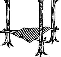 Особенно холодно спать под утро. Кроме того, что на земле спать неудобно, усталое за день тело не отдохнет, как следует, и после такого сна вы на следующий день почувствуете себя “разбитым”. Такой отдых не восстанавливает силы так необходимые в экстремальных ситуациях. Нарубить веток ели или сосны. Воткните под углом нижние концы в землю, рядом, как черепицу. Положите по краям четыре тонкие жерди – две длинные и две короткие, скрепите их в углах вбитыми в землю колышками.