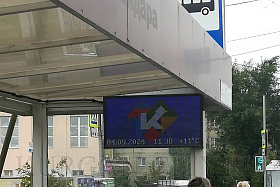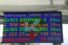На электронном табло отражаются дата, время, температура воздуха, минуты до прибытия автобуса и номер маршрута. Всего на экране размещаются 7 строк. Нижняя строка предназначена для отображения информации в виде «бегущей строки».