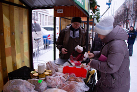 Самозанятый Николай Битюцкий приехал на Рождественскую ярмарку из Притобольного округа. Рассказал, что держит большое подсобное хозяйство. В работе ярмарки участвует второй раз. «В прошлом году первый раз здесь торговали, неплохо. У нас птица – гуси, утки, мясо свиное, тушенка, сало соленое и колбаса собственного производства, курица копченая. Особенно любят горожане сало, колбасу, тушенку. Разбирают хорошо. Птица на свободном выгуле находится, тушки большие. Водоем у нас рядом, травы много, зерно имеется», - рассказал он.