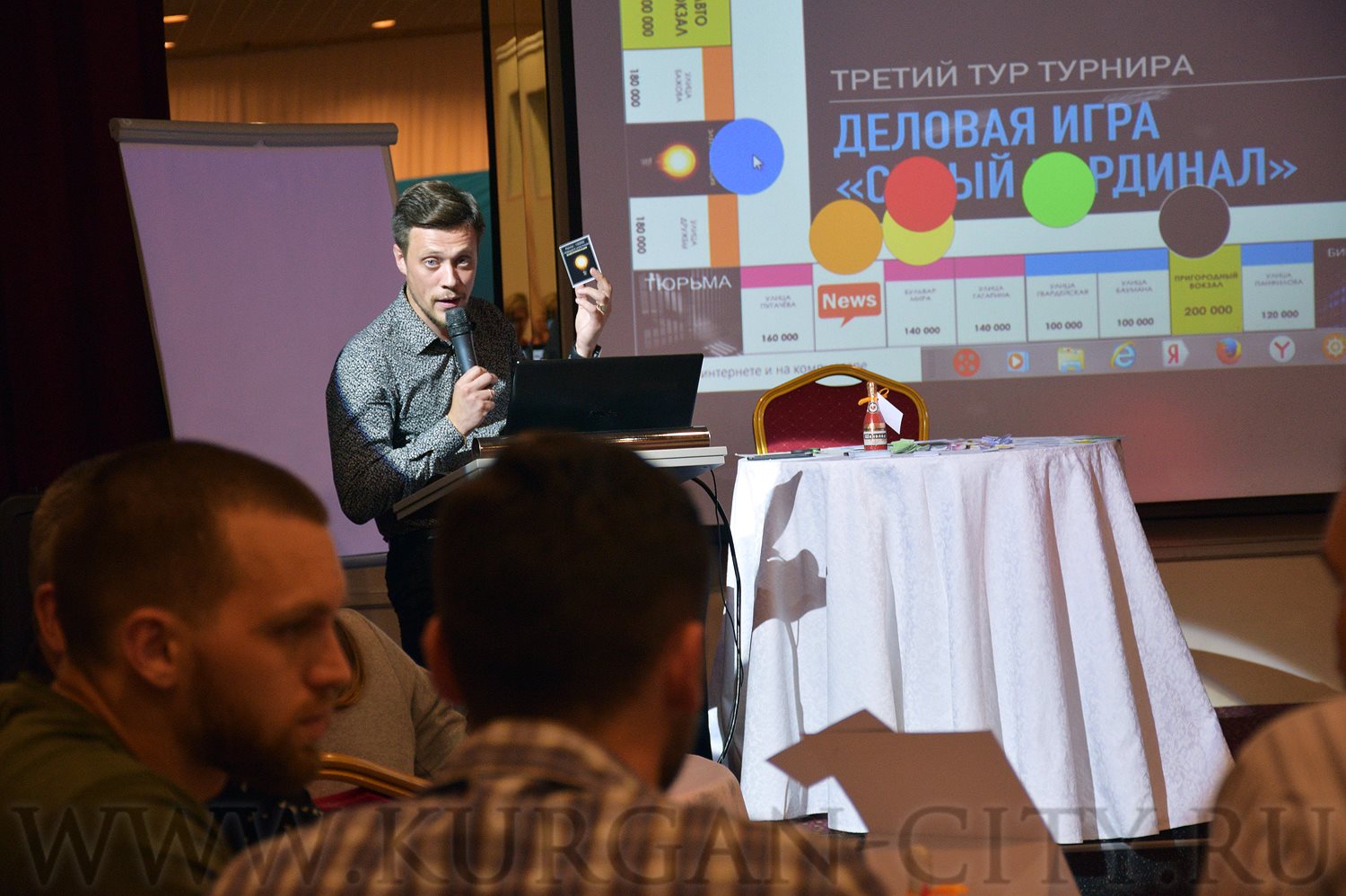 Деловая игра прошла в формате всем известной «Монополии». На игровом поле, которое в какой-то мере отражало карту Кургана, участники попытались построить свой бизнес. Каждый из них приступил к игре со своим заработанным ранее стартовым капиталом. В качестве валюты соперники использовали условные единицы.