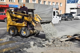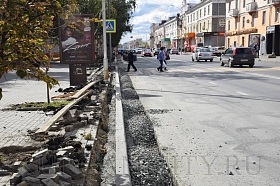 Подрядчик МУП «СДП» производит разборку бортового камня, а на его место укладывает новый. Местами на тротуарах выполнено фрезерование асфальта и снята старая плитка.