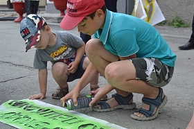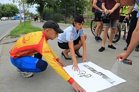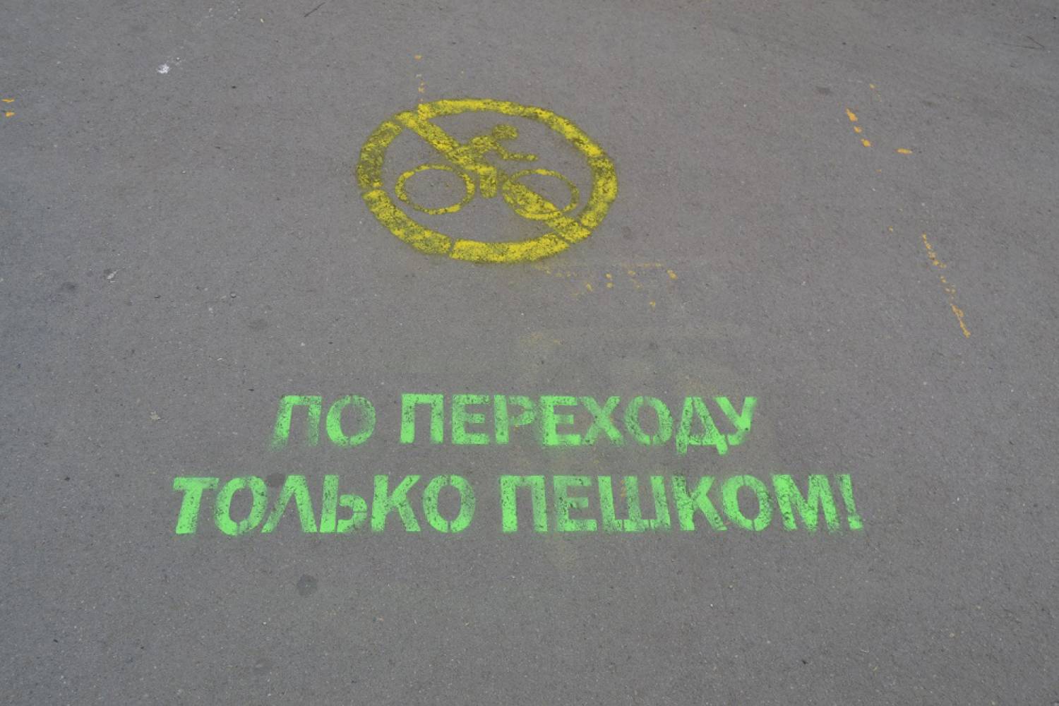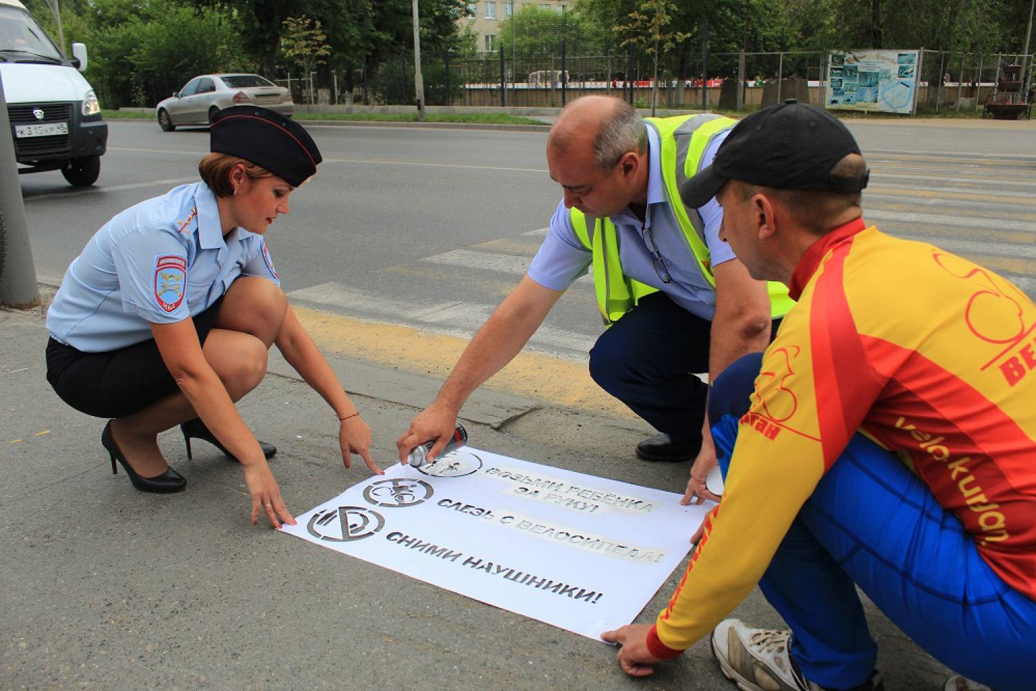 Все желающие также присоединились к акции по нанесению перед пешеходными переходами предупреждающих призывов: «По переходу только пешком!». Такие красочные надписи появились на пересечении центральных улиц города с наиболее интенсивным движением, вблизи парков, зон отдыха и детских образовательных учреждений.