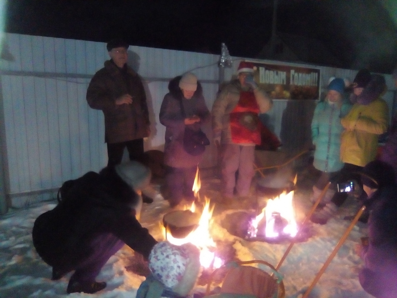 Жители поселка угощали всех желающих горячим чаем из самовара и пельменями приготовленными на костре, которые накануне сами приготовили.