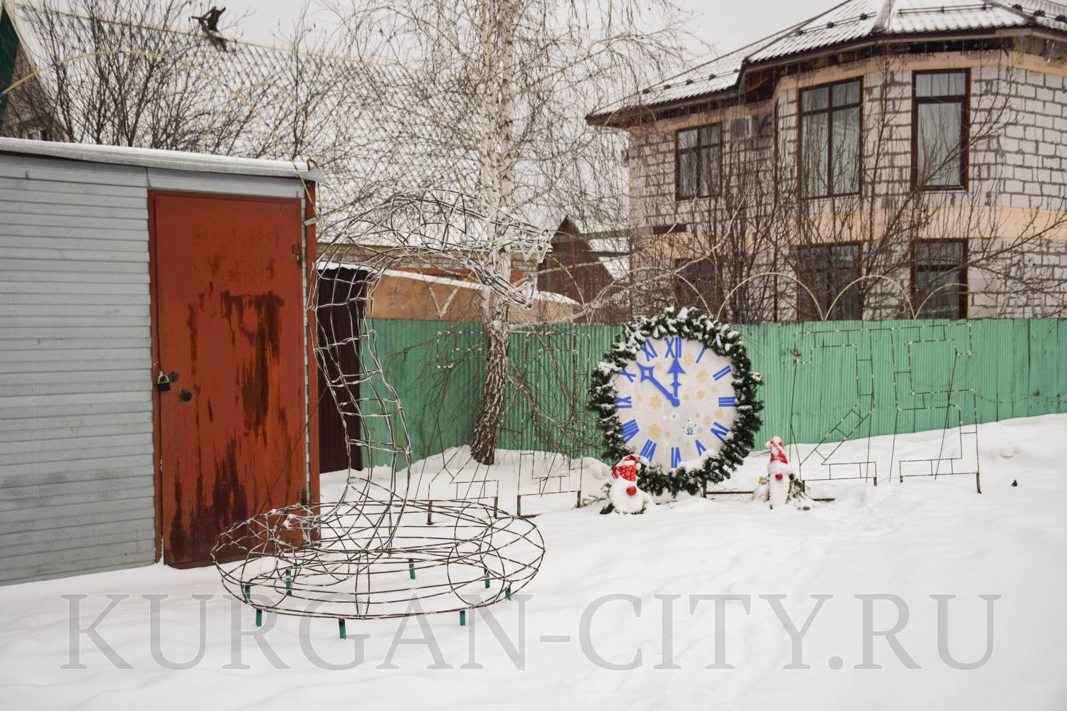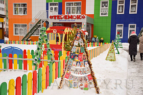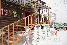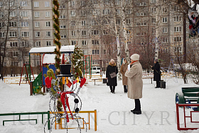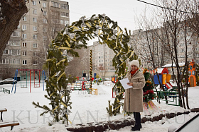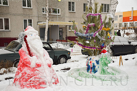 Председатель дома № 14 в 3 микрорайоне Лариса Сурикова с удовольствием показывает и рассказывает о чудесах и чудесных людях своего двора. Чтобы вылепить снежных героев, активисты собирали первый снег повсюду, возили во двор его тележками. И, как итог, появилось отличное место отдыха для взрослых и детей с вечерней светомузыкой. А какие сказочные герои здесь водятся! Даже Бабка Ёжка раскачивается на ветвях дерева. Входят на территорию сказки через красивую зелёную еловую арку, которую, кстати, также изготовил местный сварщик.
