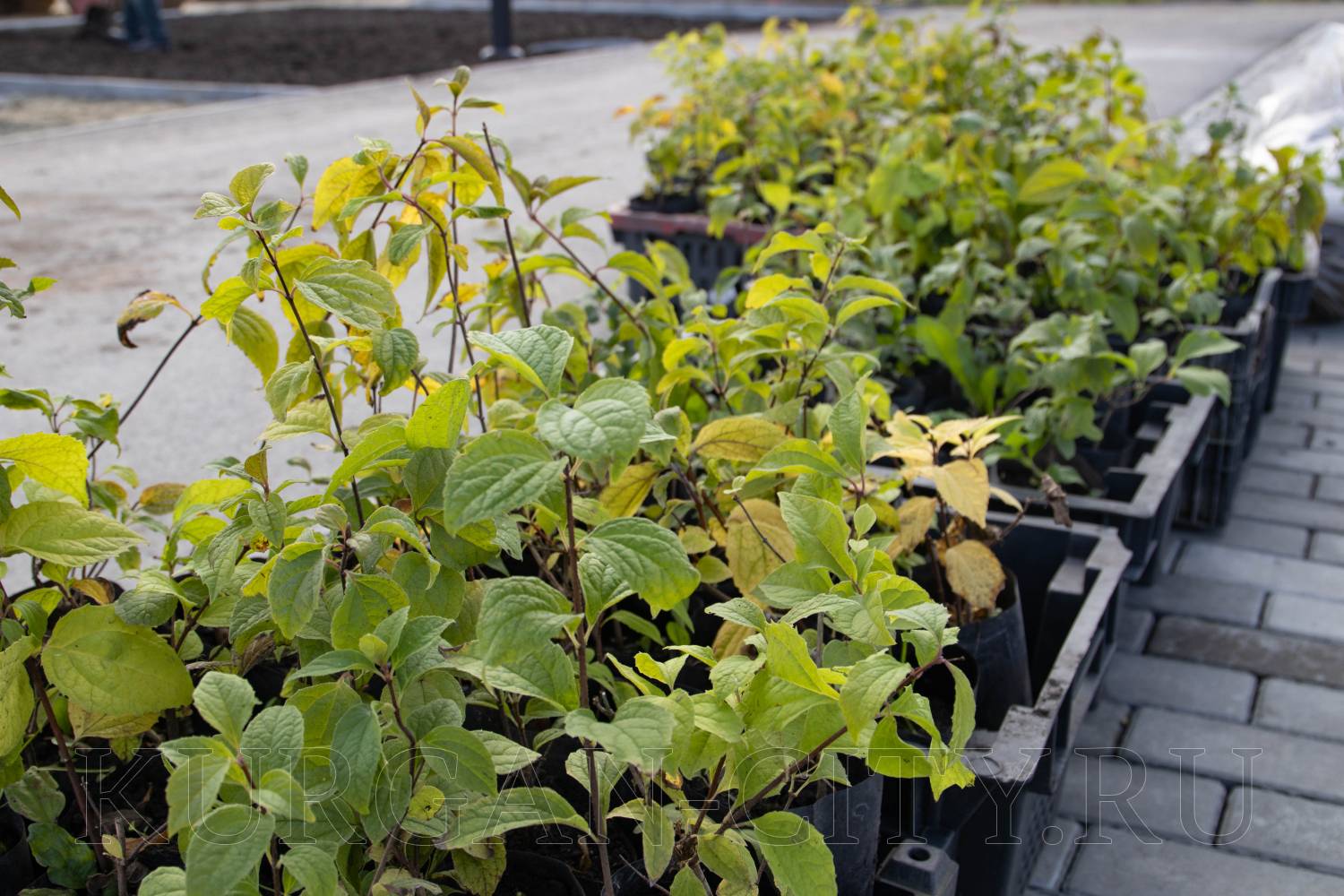 Сотрудники департамента строительства, госэкспертизы и жилищно-коммунального хозяйства Курганской области – порядка 30-ти человек – высадили на территории парка 200 кустов форзиции и жасмина, а также луковичные растения – тюльпаны. Декоративные кустарники – форзиция и жасмин – призваны образовать живую волнообразную изгородь.