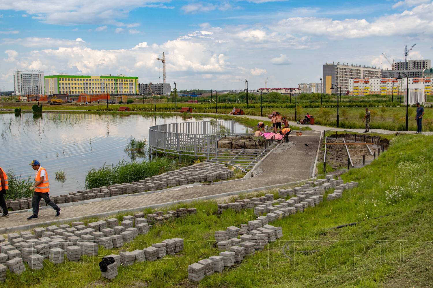 У водоема также началась укладка деревянного настила.
