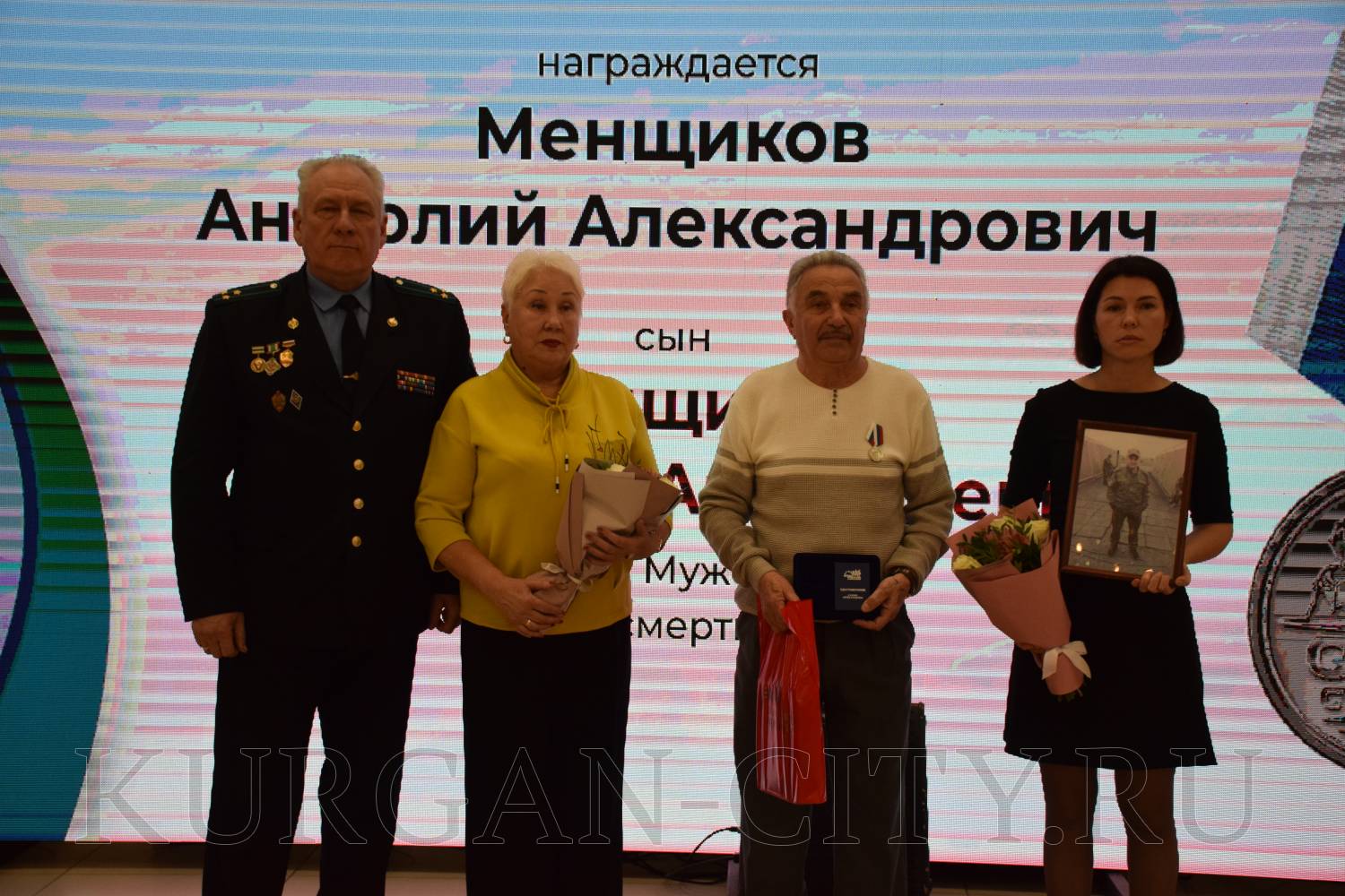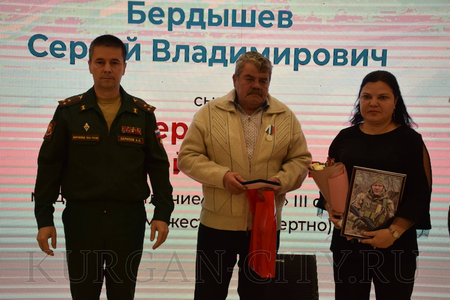На вручение медали «Отец солдата» курганская семья Бердышевых пришла почти в полном составе. Глава семейства Сергей Бердышев рассказал, что трудился в локомотивном депо Кургана. Сын Алексей работал в УФСИН, где его уважали и ценили, награжден медалью «За отличие в службе» и посмертно - орденом Мужества. «Двое внуков осталось у сына, похожих на него. Сейчас ими любуемся, вспоминаем Алексея», - поделился отец Сергей Бердышев.