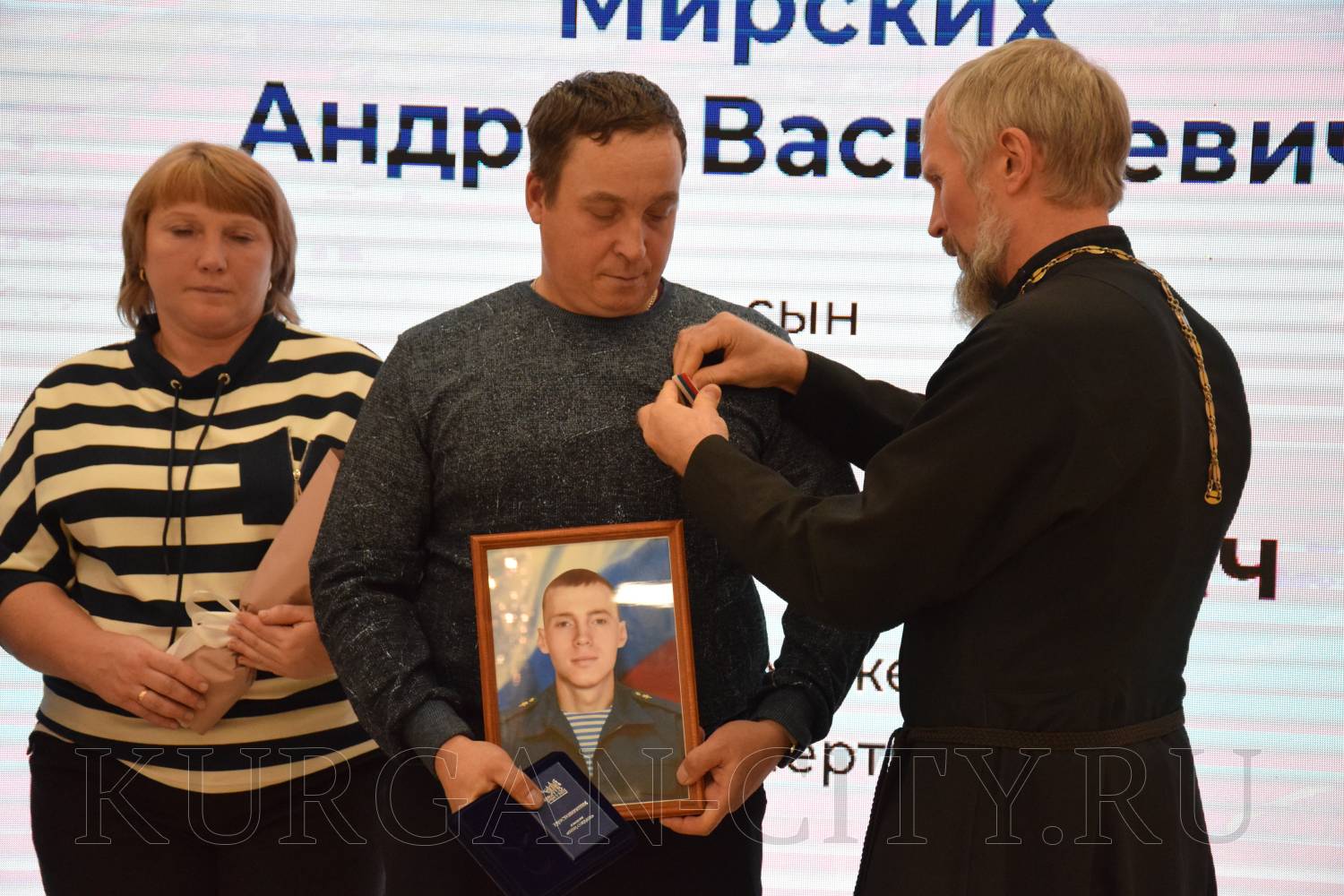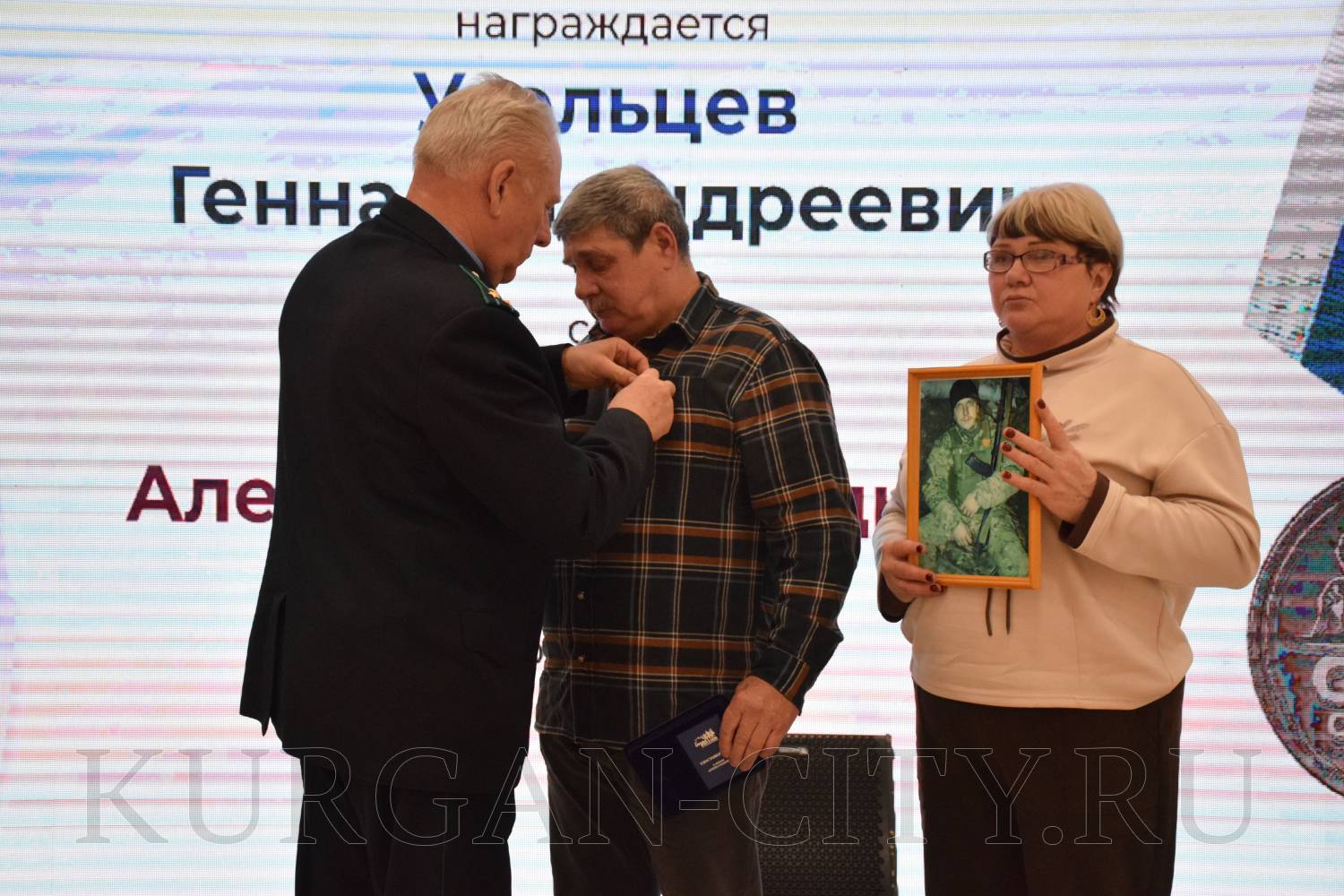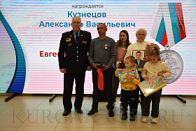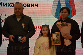 В числе награждённых был курганец Геннадий Усольцев, который всю жизнь трудился строителем. Геннадий поделился своей болью от потери сына Александра, который погиб в 2023 году, награжден орденом Мужества посмертно. «В вагонно-ремонтном депо, где трудился Александр, установлен мемориал в его честь. Портрет сына висел на Доске Почёта за трудовые показатели, у него остались двое детей и жена. Добровольцем ушел на СВО, сказал на прощание: «Буду защищать Родину, вы должны гордиться мной». Вот и гордимся», - рассказал Геннадий Усольцев. На церемонию вручения медали семья пришла вместе с папой. Сына Александра помнят как веселого и позитивного человека, доброго.
