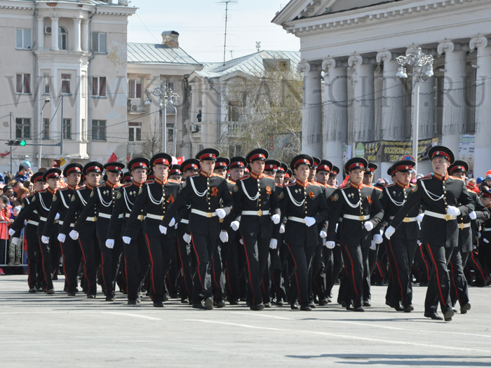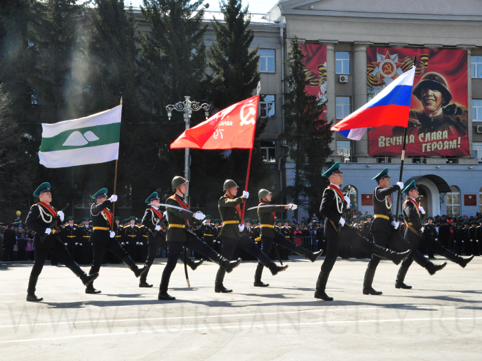 Парад, посвященный 9 мая, начался с прохода знаменной группы, пронесшей копию Знамени Победы, Государственный флаг Российской Федерации и флаг Курганской области. Вслед за знаменной группой прошагали курсанты Курганского пограничного института ФСБ России со штандартами фронтов Великой Отечественной войны. Под аккомпанимент военно-духового оркестра КПИ ФСБ Росии, чеканя шаг, по центральной площади города прошли те, кто обеспечивает безопасность и целостность государства в мирное время, преумножая боевые традиции своих отцов и дедов - колонны парадного расчета Курганского пограничного института ФСБ России, УМВД России по Курганской области, Управления федеральной службы исполнения наказаний, Управления федеральной службы судебных приставов. Торжественным маршем прошагали внуки и правнуки Победы – кадеты Курганского промышленного техникума, курганских школ № 23 имени 32-го запасного лыжного полка и №24, юнармейцы профильных классов МВД и МЧС школы №75 имени Героя России Евгения Родькина.