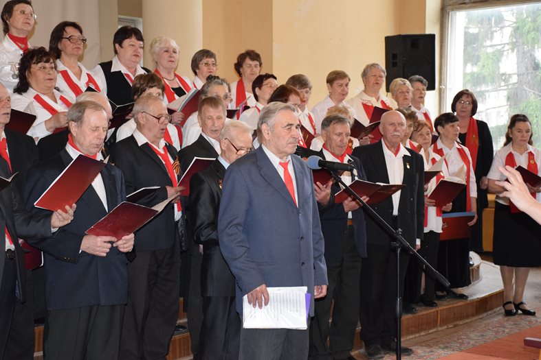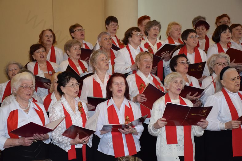 Ветераны хора исполнили песни военной тематики и прочли тематические стихи, продемонстрировав высокий уровень исполнительского мастерства. Благодарная публика активно поддерживала и аплодировала, исполняя вместе с ними известные всем произведения.