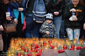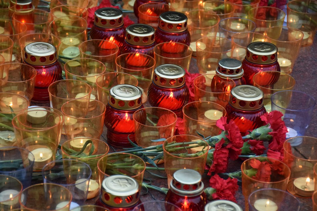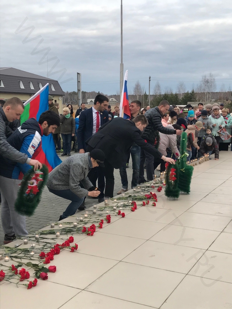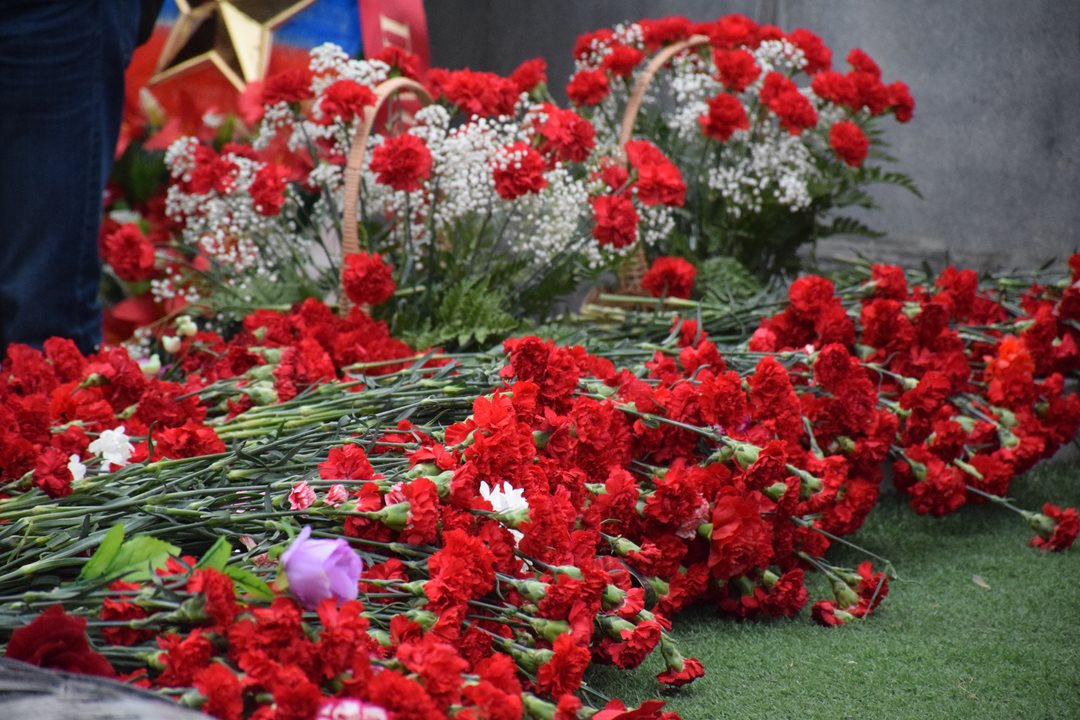 В знак великой благодарности павшим героям сотни горожан оставили зажженные свечи у гранитных плит.