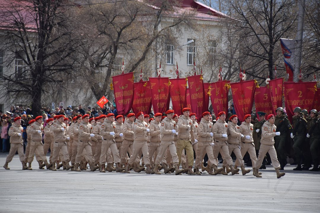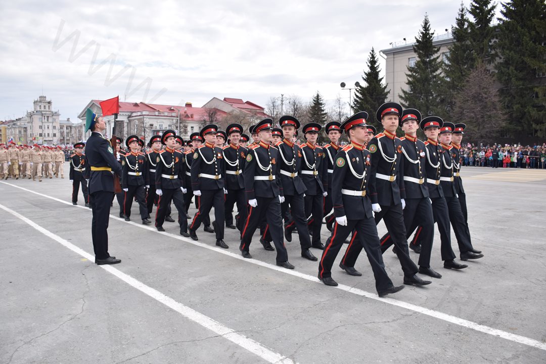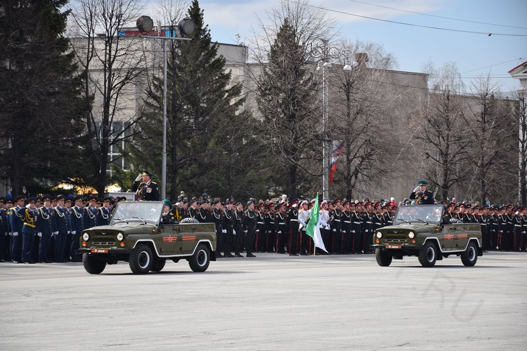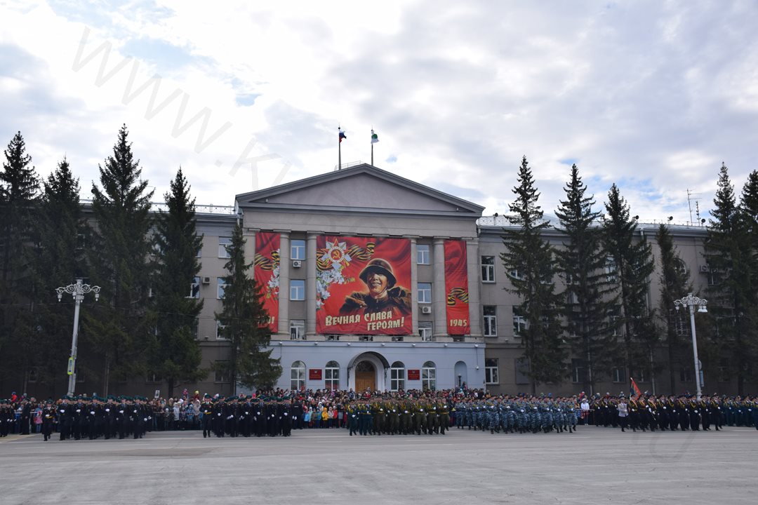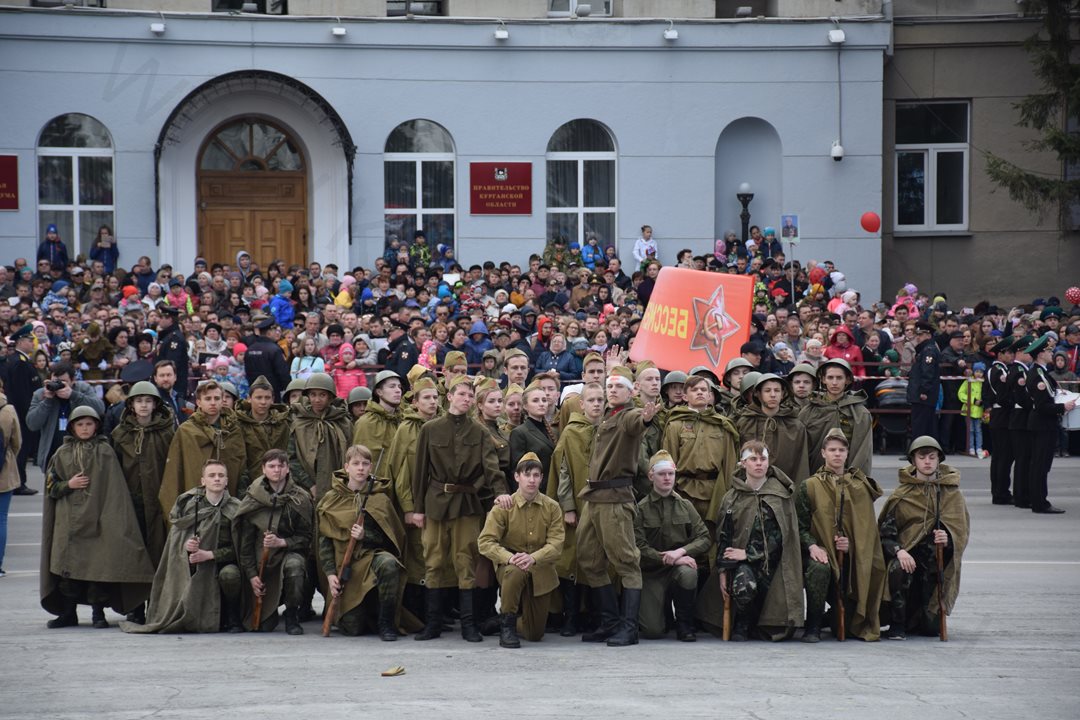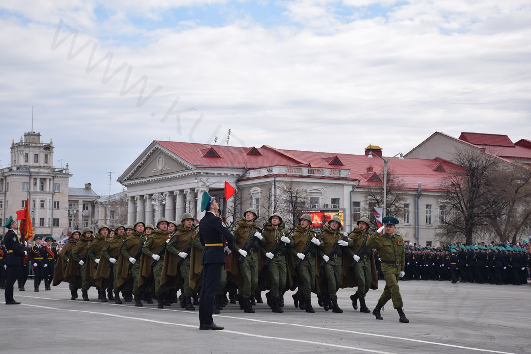 Парад, посвященный 9 мая, начался с прохода знаменной группы, пронесшей копию Знамени Победы, Государственный флаг Российской Федерации и флаг Курганской области. Вслед за знаменной группой прошагали курсанты Курганского пограничного института ФСБ России со штандартами фронтов Великой Отечественной войны. Под аккомпанемент военно-духового оркестра КПИ ФСБ России, чеканя шаг, по центральной площади города прошли те, кто обеспечивает безопасность и целостность государства в мирное время, преумножая боевые традиции своих отцов и дедов - колонны Курганского пограничного института ФСБ России, военнослужащие и сотрудники отдела Росгвардии по Курганской области, Управления Министерства внутренних дел России по Курганской области, Федеральной службы исполнения наказаний Российской Федерации по Курганской области, регионального Управления Федеральной службы судебных приставов, МЧС России по Курганской области. Торжественным маршем прошагали внуки и правнуки Победы – кадеты Курганского промышленного техникума, курганских школ № 23 имени 32-го запасного лыжного полка и №24, юнармейцы школы №75 имени Героя России Евгения Родькина.