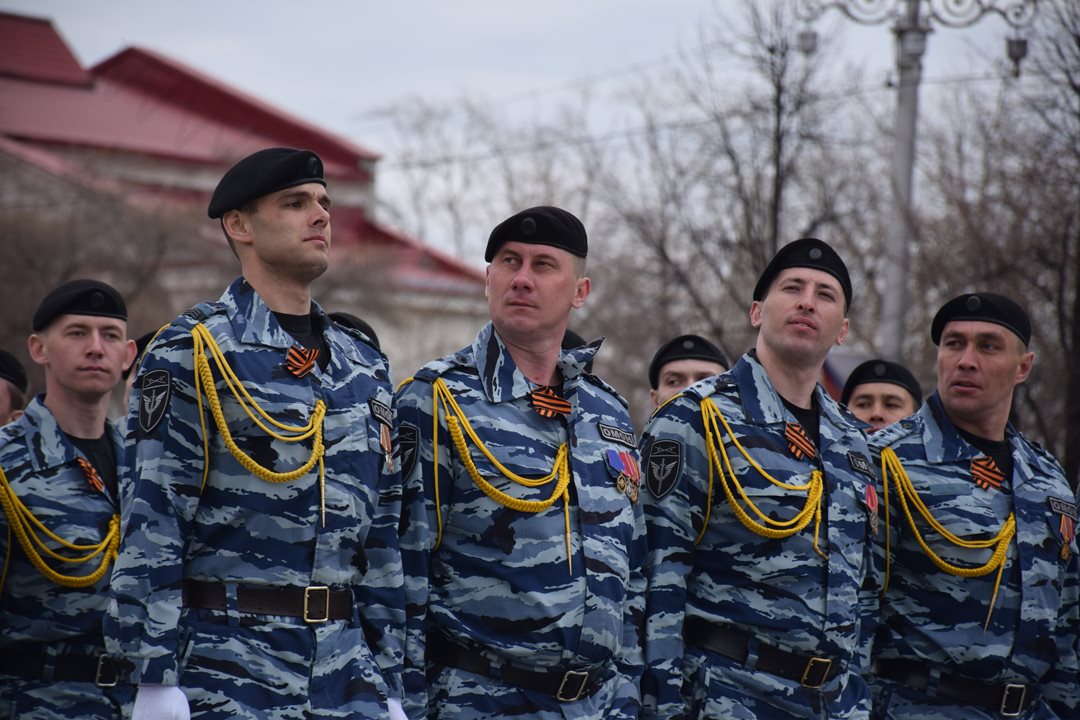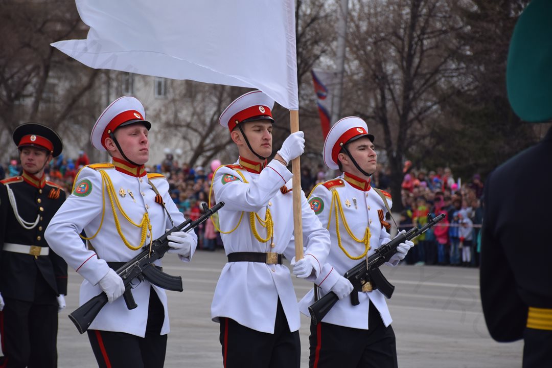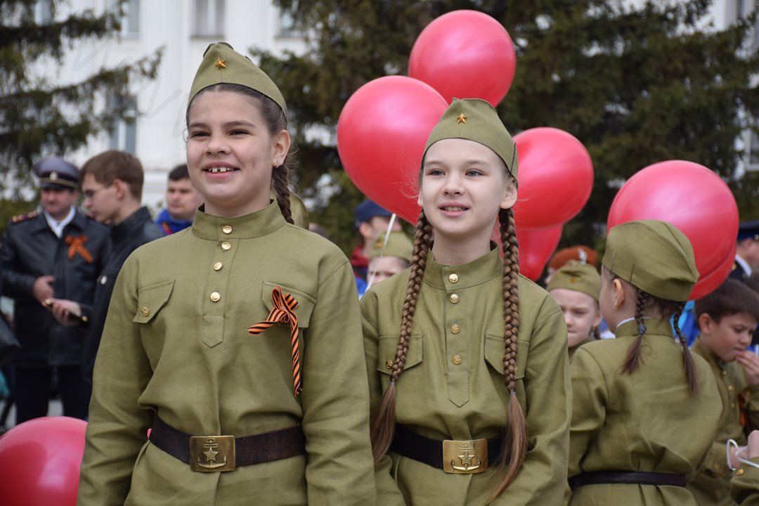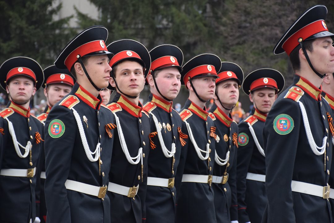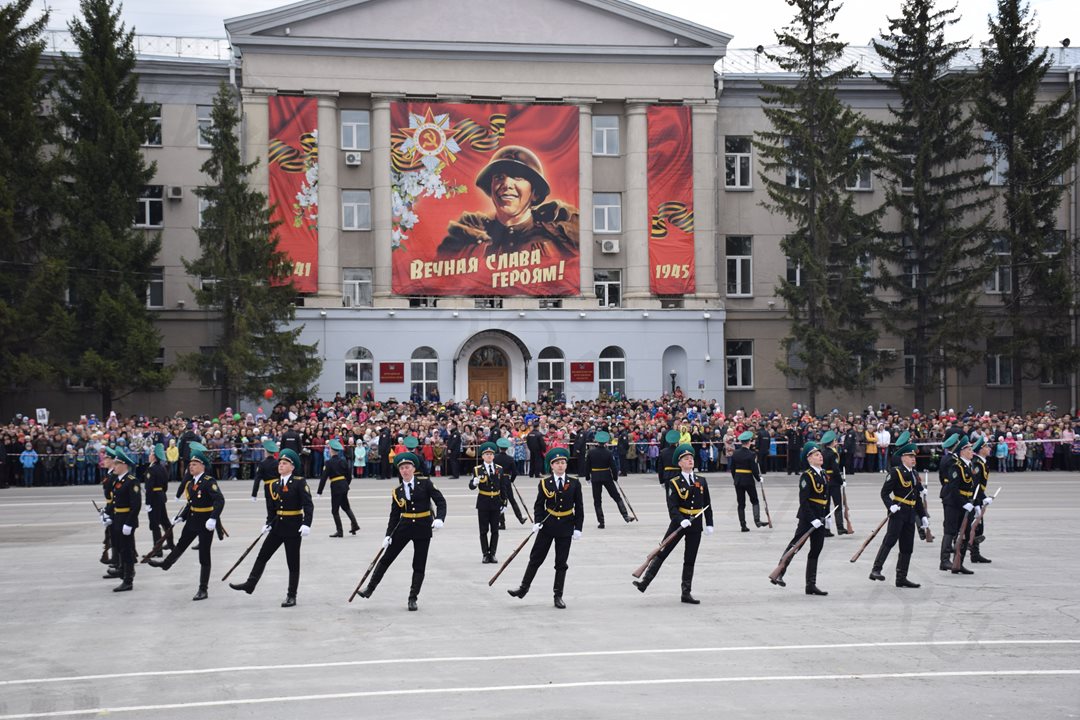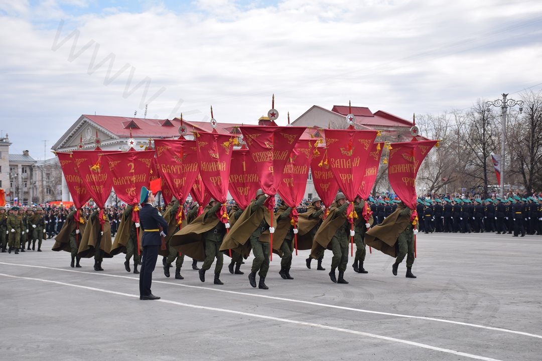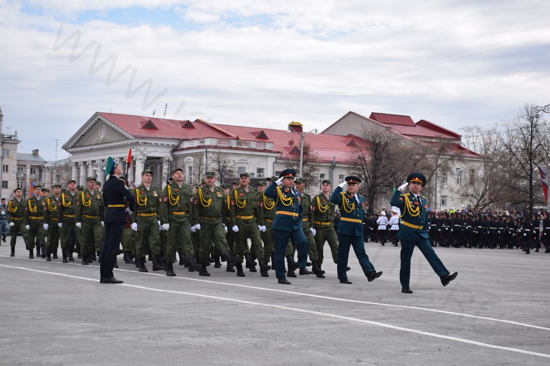 Парад, посвященный 9 мая, начался с прохода знаменной группы, пронесшей копию Знамени Победы, Государственный флаг Российской Федерации и флаг Курганской области. Вслед за знаменной группой прошагали курсанты Курганского пограничного института ФСБ России со штандартами фронтов Великой Отечественной войны. Под аккомпанемент военно-духового оркестра КПИ ФСБ России, чеканя шаг, по центральной площади города прошли те, кто обеспечивает безопасность и целостность государства в мирное время, преумножая боевые традиции своих отцов и дедов - колонны Курганского пограничного института ФСБ России, военнослужащие и сотрудники отдела Росгвардии по Курганской области, Управления Министерства внутренних дел России по Курганской области, Федеральной службы исполнения наказаний Российской Федерации по Курганской области, регионального Управления Федеральной службы судебных приставов, МЧС России по Курганской области. Торжественным маршем прошагали внуки и правнуки Победы – кадеты Курганского промышленного техникума, курганских школ № 23 имени 32-го запасного лыжного полка и №24, юнармейцы школы №75 имени Героя России Евгения Родькина.
