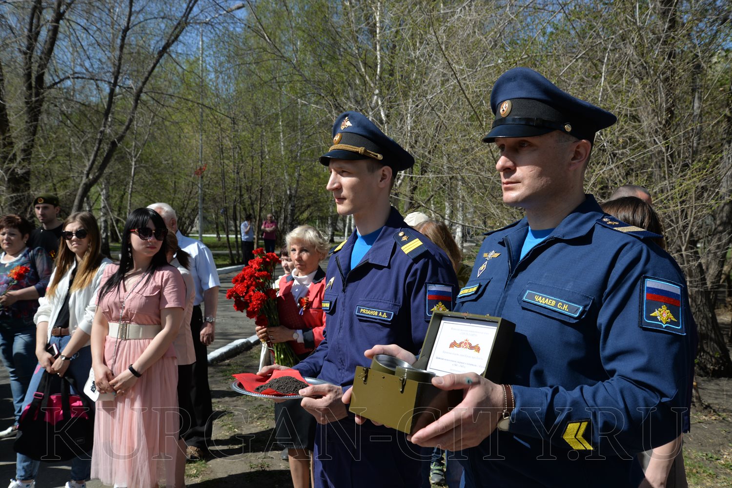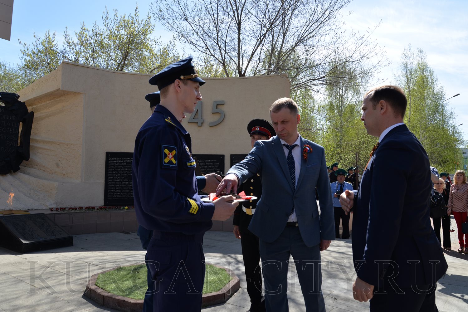 Для проведения церемонии передачи священной земли были приглашены временно исполняющий обязанности Губернатора Курганской области Вадим Шумков, Глава города Кургана Андрей Потапов и юнармец Андрей Лушников. Они поместили землю с братской могилы военнослужащих, умерших от ран в госпиталях города Кургана в Великой Отечественной войне 1941-1945 годов, в специальную капсулу. Как отмечалось, в дальнейшем данная капсула будет передана на хранение в историко-мемориальный комплекс Главного Храма Вооруженных сил РФ.