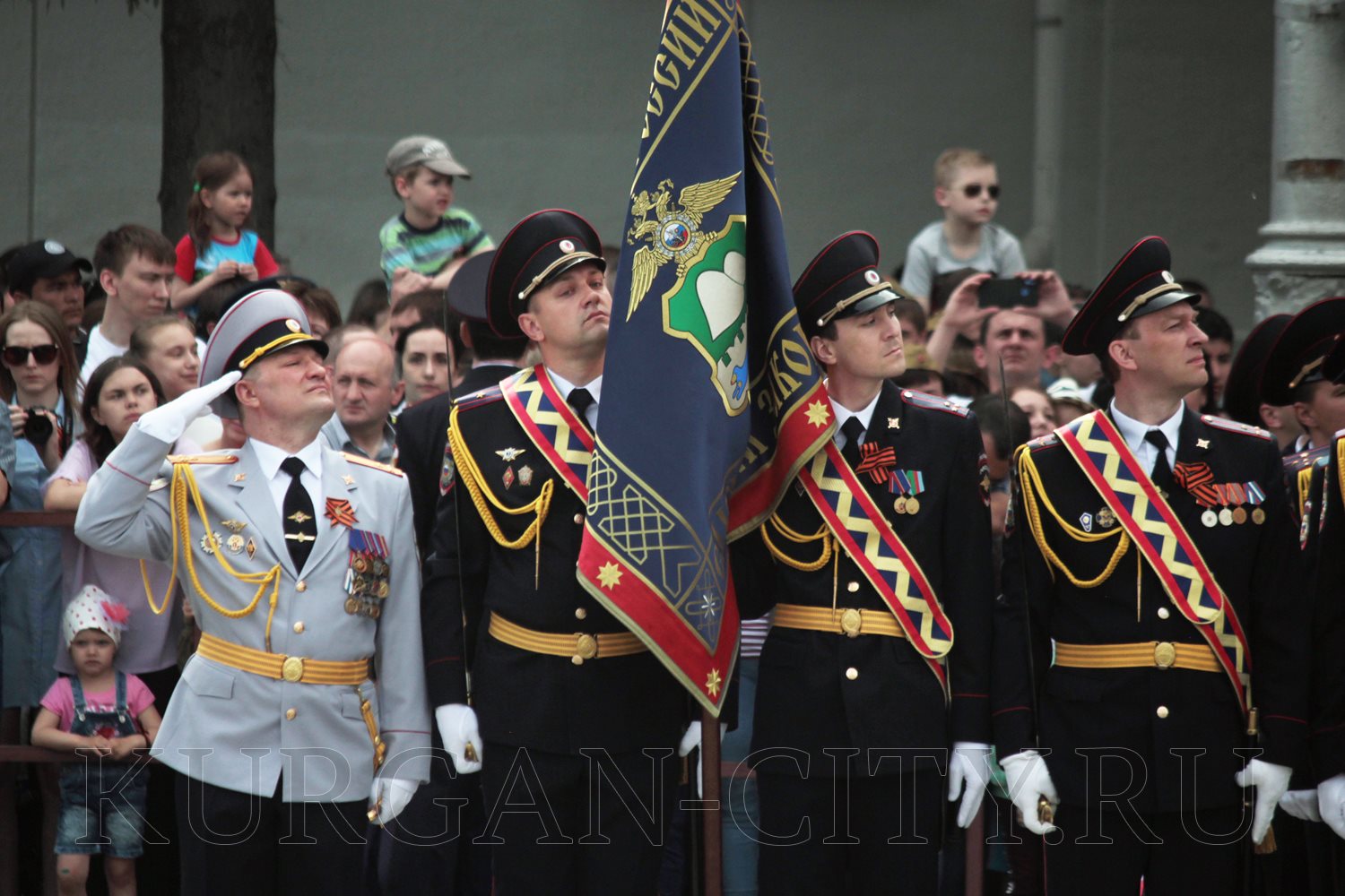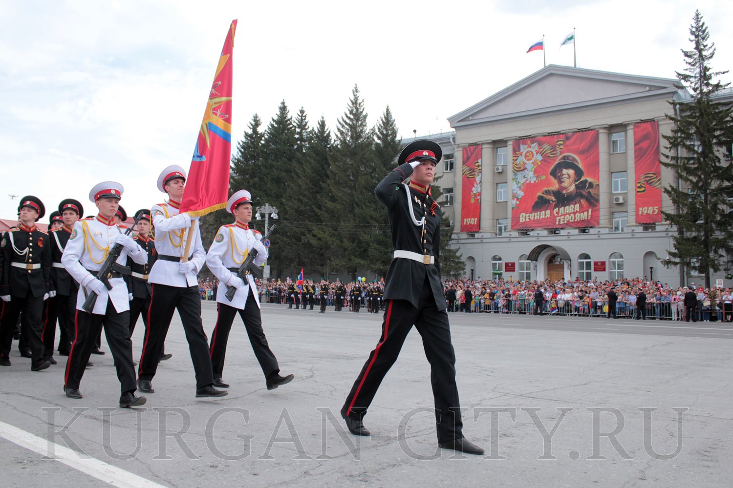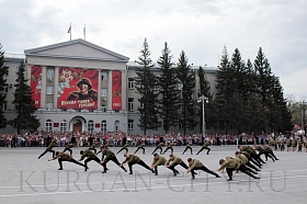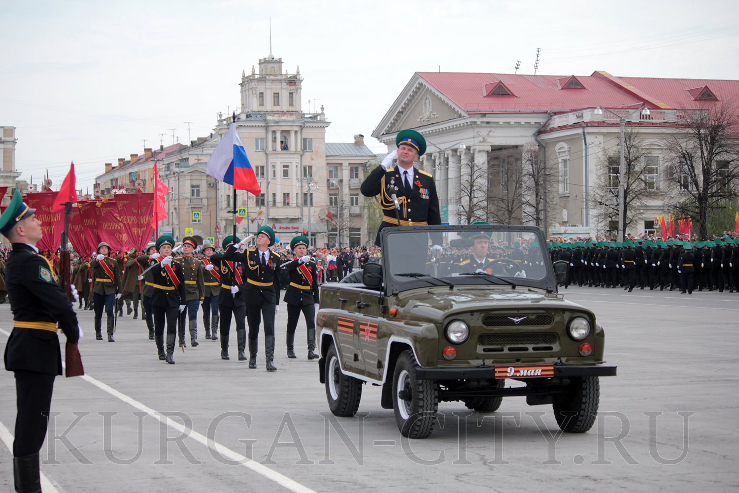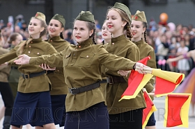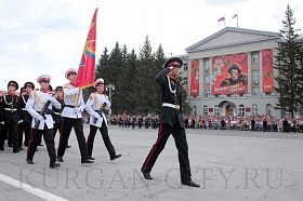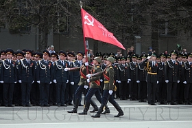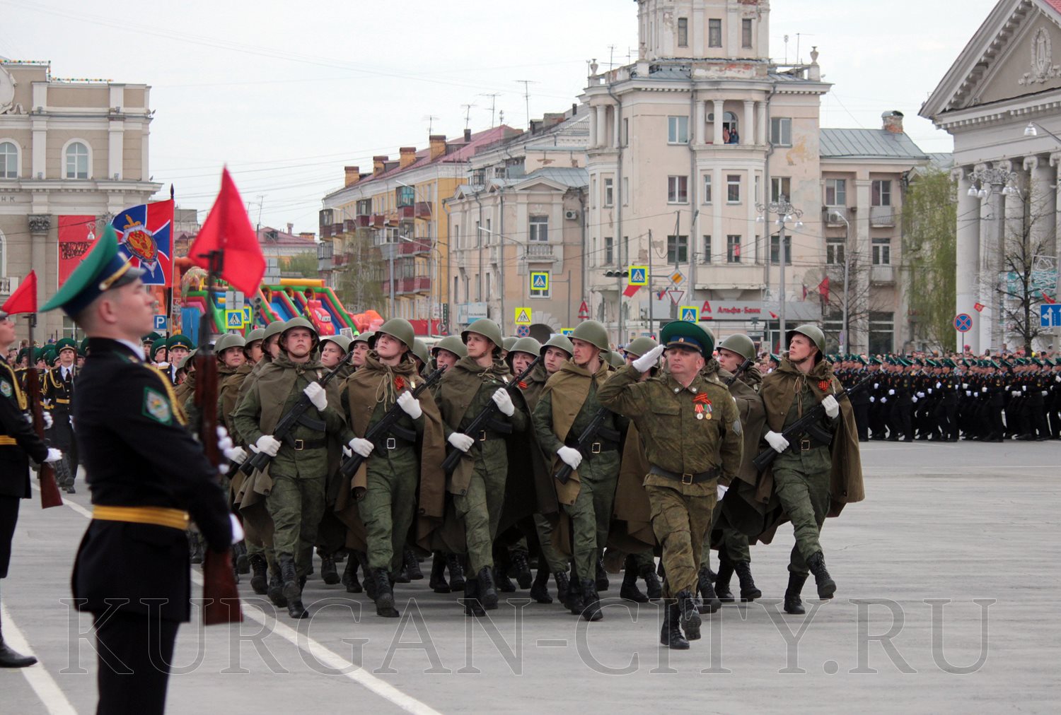 Парад, посвященный 9 мая, начался с прохода знаменной группы, пронесшей под звуки военно-духового оркестра КПИ ФСБ России Государственный флаг Российской Федерации и копию Знамени Победы – штурмовой флаг 150-й Ордена Кутузова II степени Идрицкой стрелковой дивизии, который был водружён 1 мая 1945 года на здании рейхстага в городе Берлине. Вслед за знаменной группой прошагали курсанты Курганского пограничного института ФСБ России со штандартами фронтов Великой Отечественной войны.