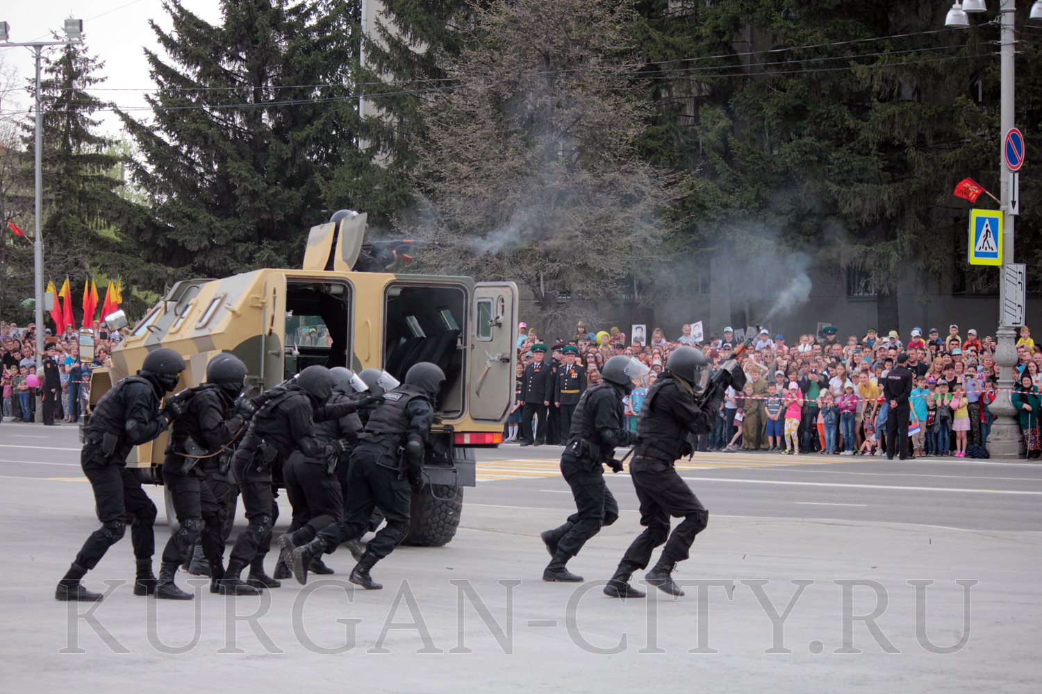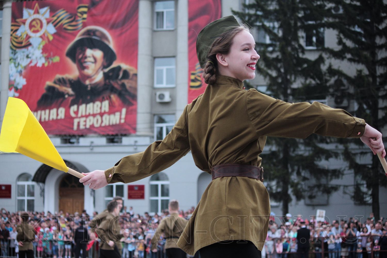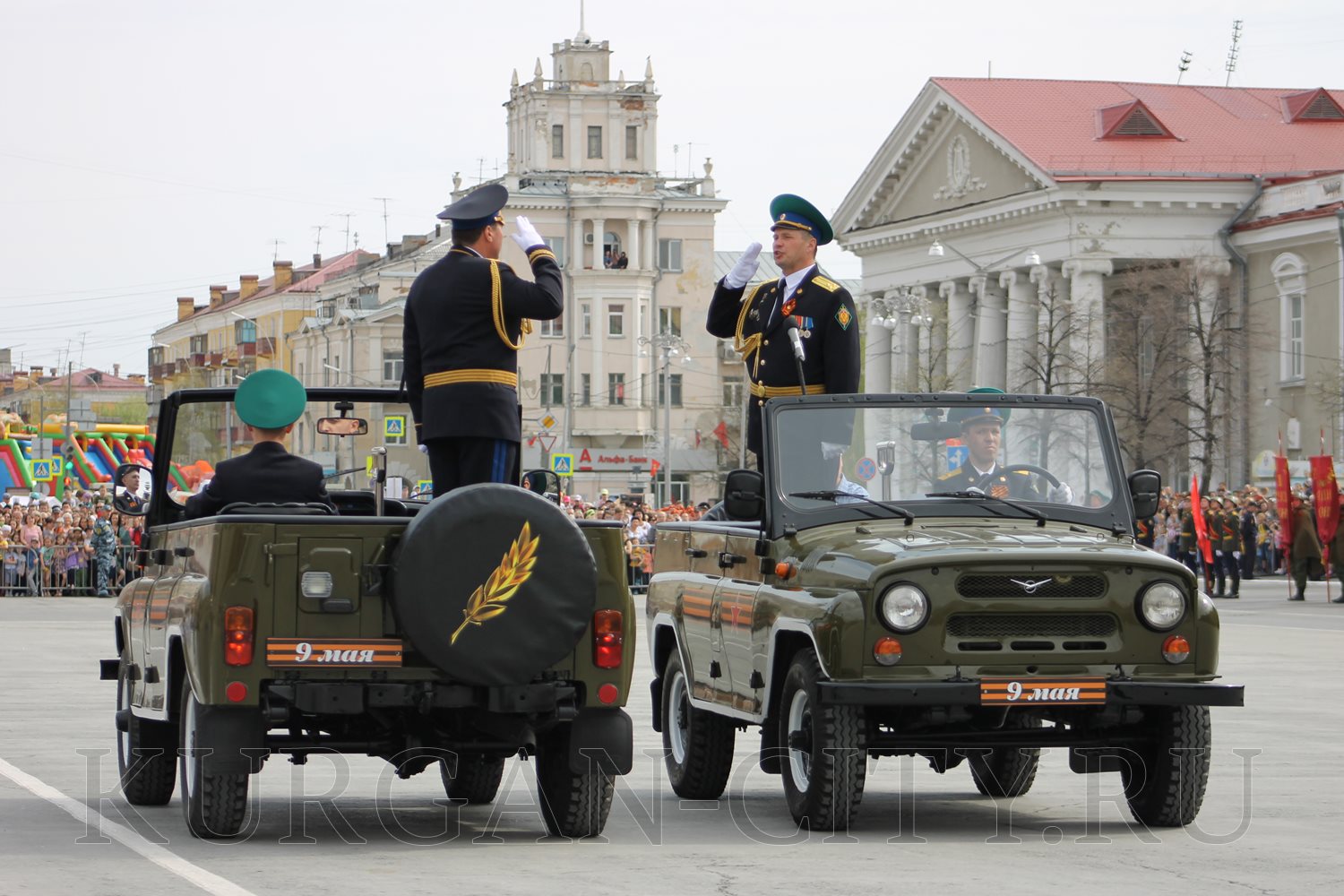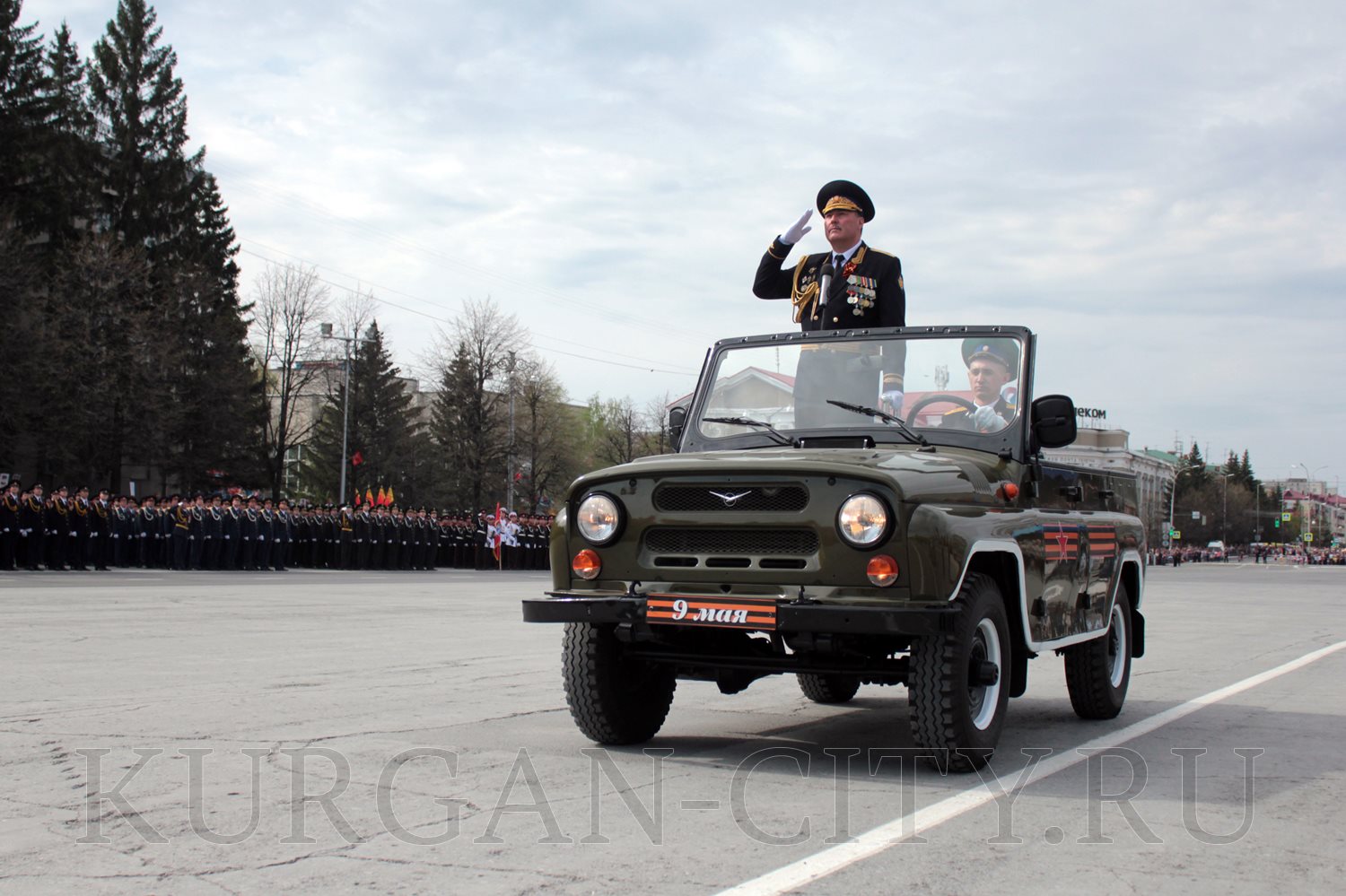 Парад, посвященный 9 мая, начался с прохода знаменной группы, пронесшей под звуки военно-духового оркестра КПИ ФСБ России Государственный флаг Российской Федерации и копию Знамени Победы – штурмовой флаг 150-й Ордена Кутузова II степени Идрицкой стрелковой дивизии, который был водружён 1 мая 1945 года на здании рейхстага в городе Берлине. Вслед за знаменной группой прошагали курсанты Курганского пограничного института ФСБ России со штандартами фронтов Великой Отечественной войны.