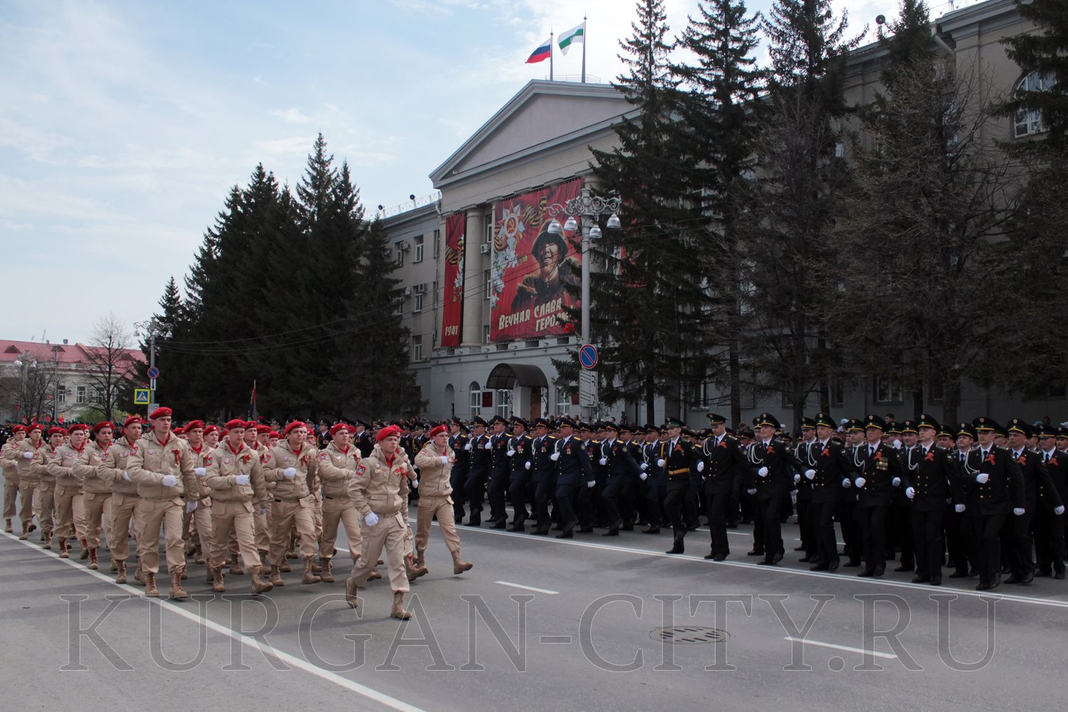 По центральной площади города прошли сыновья, внуки и правнуки героев Великой Победы, хранители боевых традиций - колонны парадного расчета Курганского пограничного института ФСБ России, военнослужащие и сотрудники Управления Росгвардии по Курганской области, УМВД России, парадный расчет Главного управления МЧС России по Курганской области, Управления федеральной службы исполнения наказаний, Управления федеральной службы судебных приставов. Торжественным маршем прошагали кадеты Курганского промышленного техникума, курганских школ № 23 имени 32-го запасного лыжного полка и № 24, учащиеся школы № 42 имени Героя Советского Союза Евгения Кремлёва, юнармейцы профильных классов школы № 75 имени Героя России Евгения Родькина.