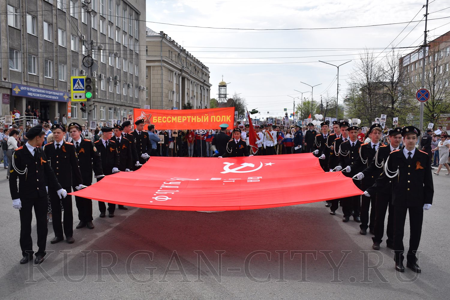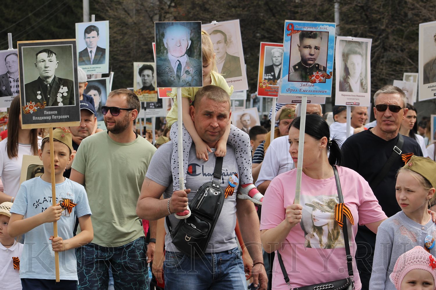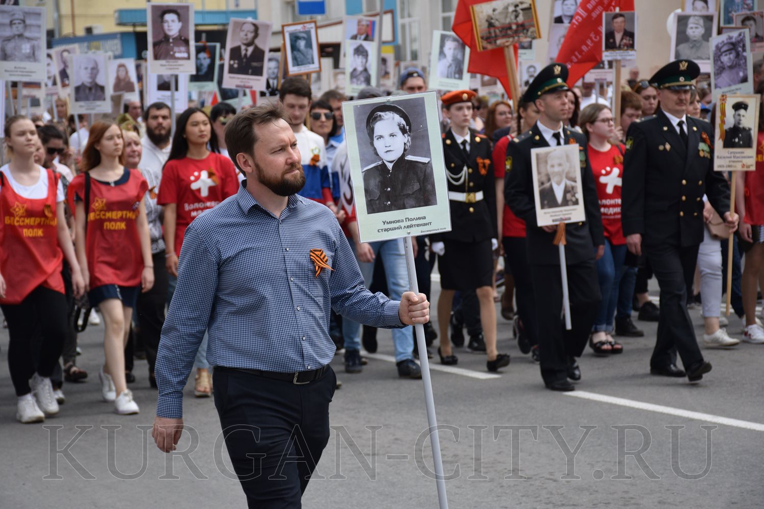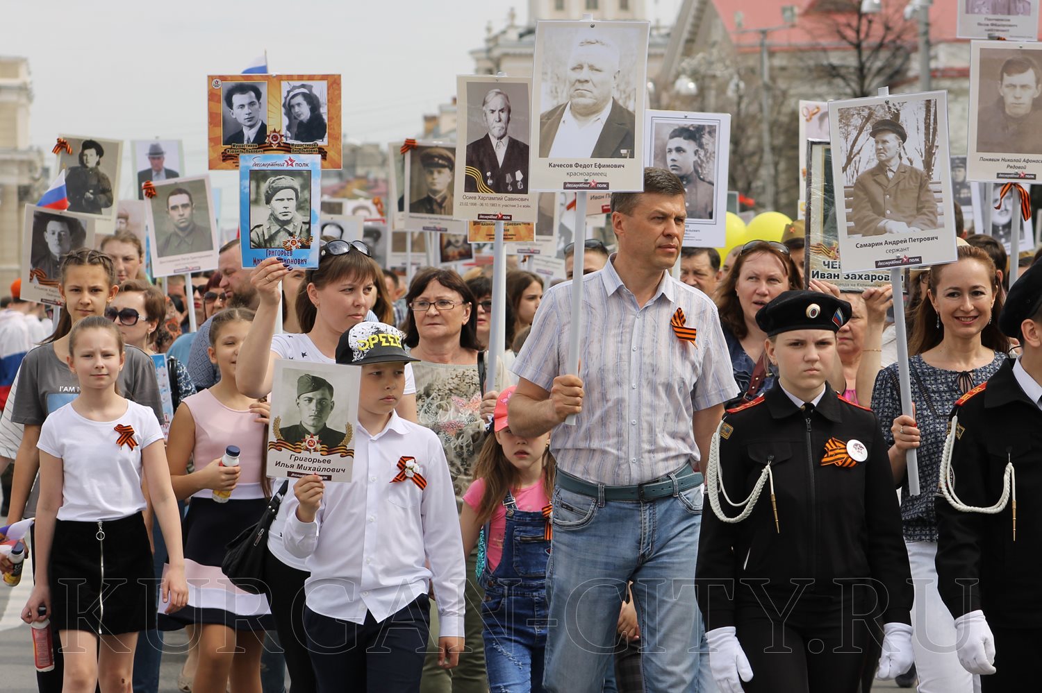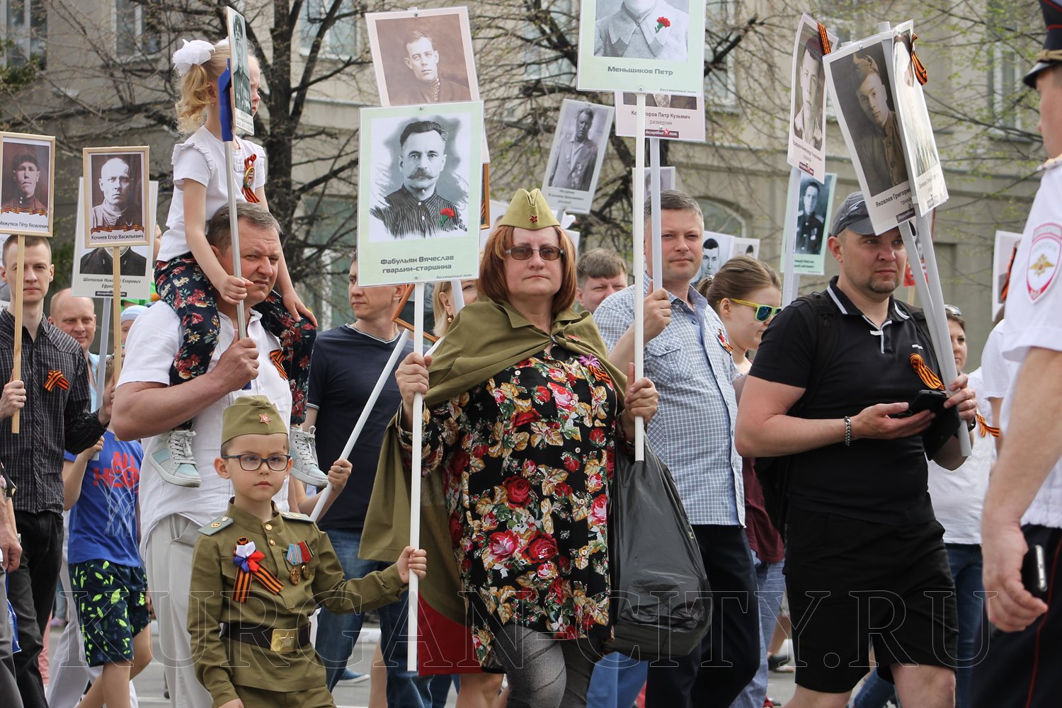 Построение колон началось с 9:30 часов на Троицкой площади. Желающих принять участие в памятной акции было очень много. Целыми семьями и парами, в одиночку и в сопровождении своих близких курганцы гордо держали штендеры с портретами своих героев. В назначенное время «Бессмертный полк» единым потоком двинулся в сторону центральной площади. Как и в предыдущие годы, он стал самым многочисленным участником торжественного мероприятия «Победителям - слава! Поколениям – мир!».