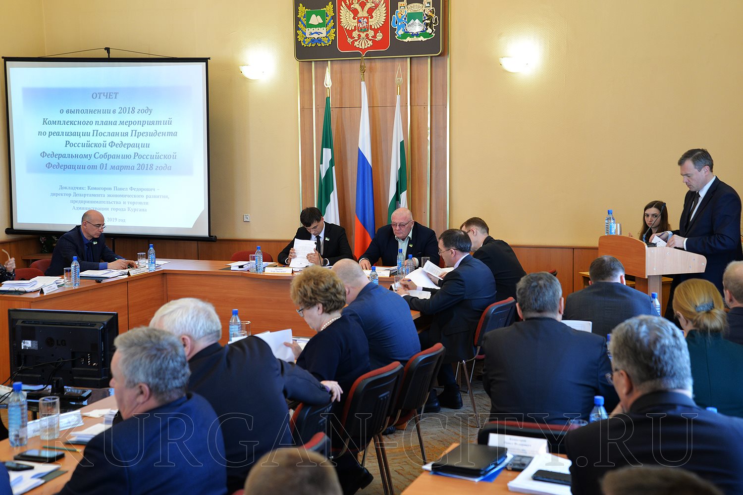 О том, как в 2018 году на территории Кургана был выполнен Комплексный план мероприятий по реализации Послания Президента Российской Федерации Федеральному Собранию Российской Федерации от 1 марта 2018 года, парламентариям доложил директор Департамента экономического развития, предпринимательства и торговли Администрации города Павел Комогоров.