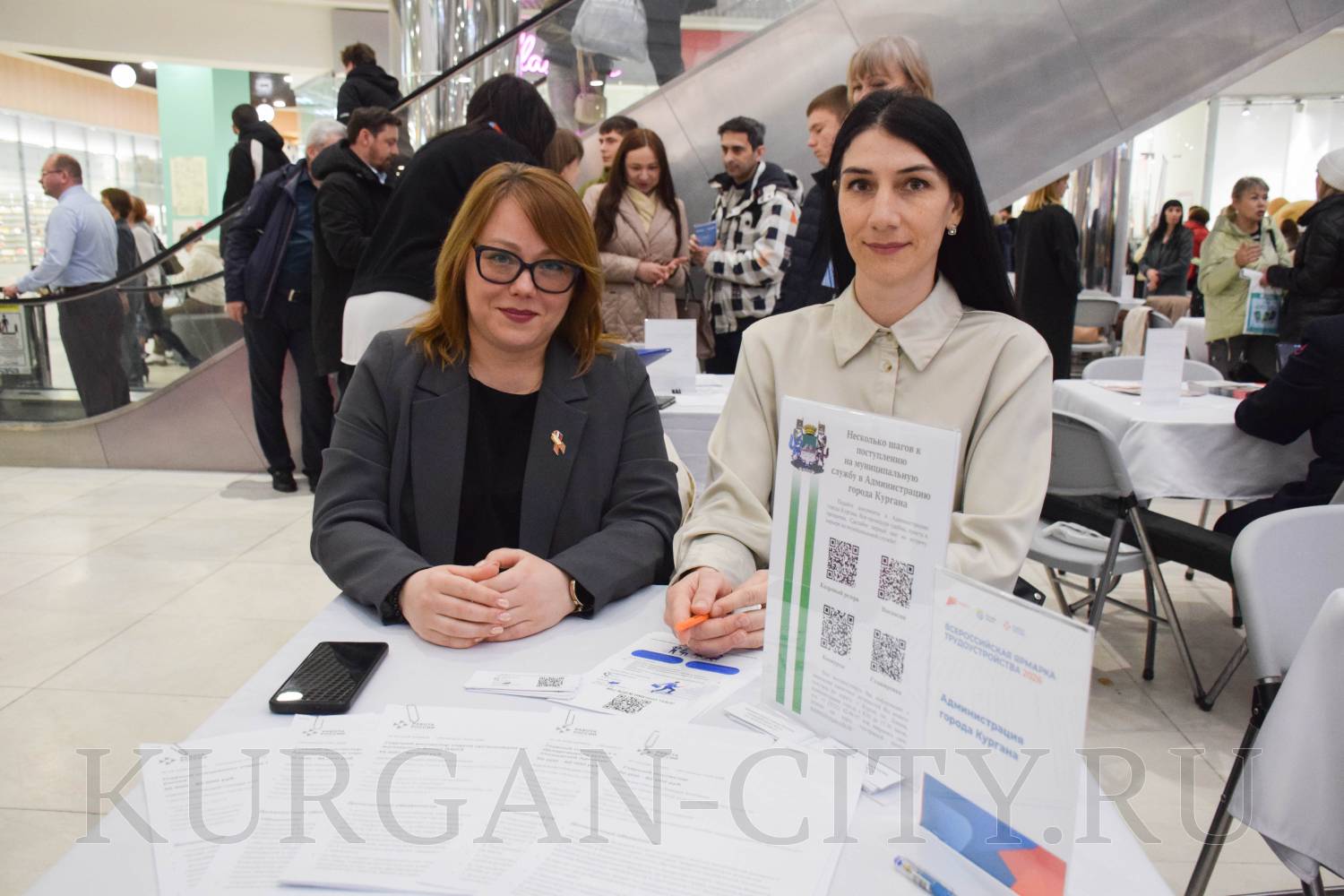 К площадке администрации города Кургана подходило немало соискателей. Здесь граждане получали консультации начальника управления муниципальной службы кадров и профилактики коррупционных правонарушений аппарата администрации города Юлии Назаровой и её заместителя Яны Старостиной. Горожане обращались по направлениям юридического сопровождения, искали работу бухгалтера, водителя. Мама студентки последнего курса колледжа уточняла, может ли её дочь трудоустроиться в администрацию города. Юлия Назарова разъяснила, что в администрации города студенты могут пройти стажировку с последующим трудоустройством после окончания учебы.