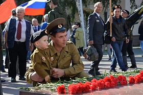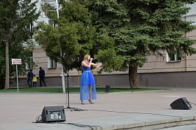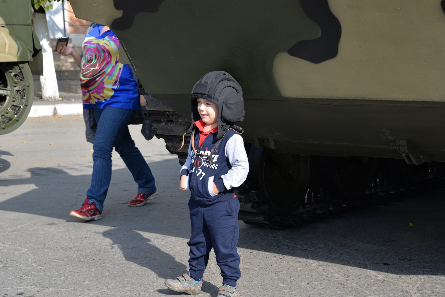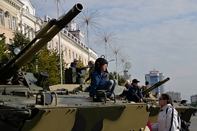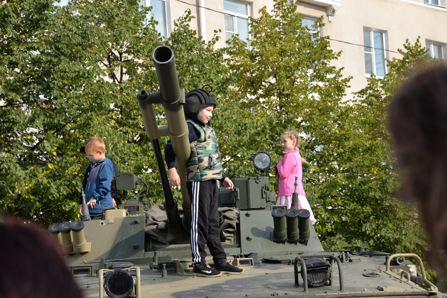 На территории около кинотеатра «Россия» была организована выставка боевой техники производства Курганского машиностроительного завода. С самого утра здесь не было отбоя от желающих сфотографироваться с настоящими боевыми машинами. Маленькие курганцы примеряли на себя шлемофоны и с гордостью отдавали честь.
