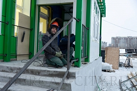 На садике в Северном работы ведутся сразу по нескольким направлениям. Отделочники штукатурят и выравнивают стены. В помещениях работают электрики. Также заканчивается монтаж пожарных лестниц, перил на входных лестницах.