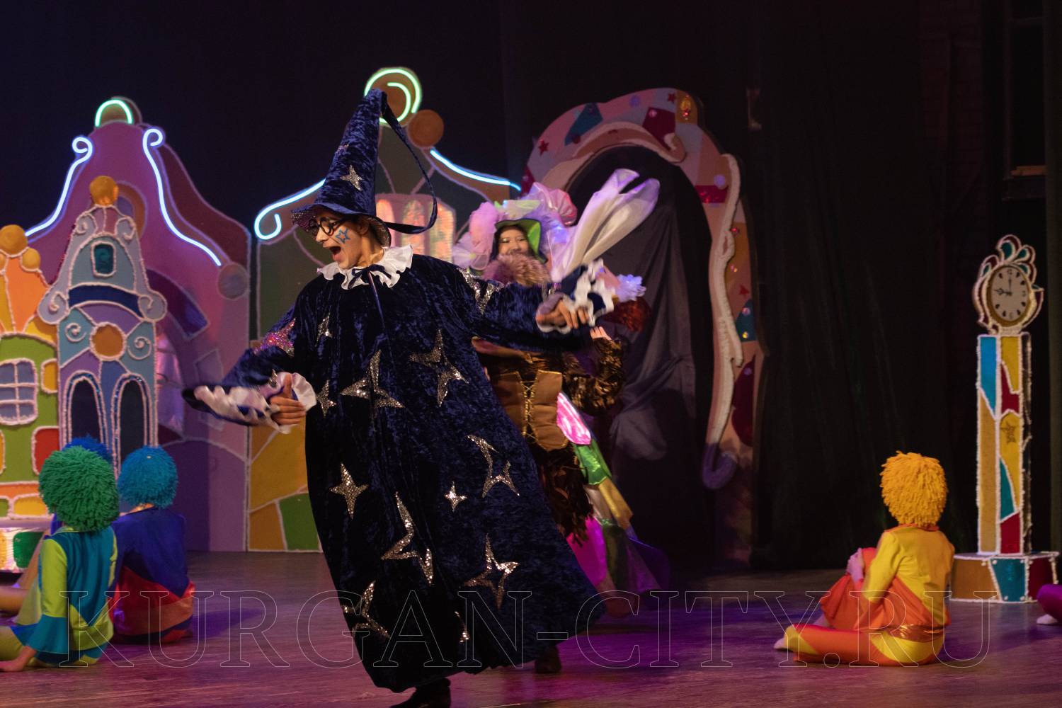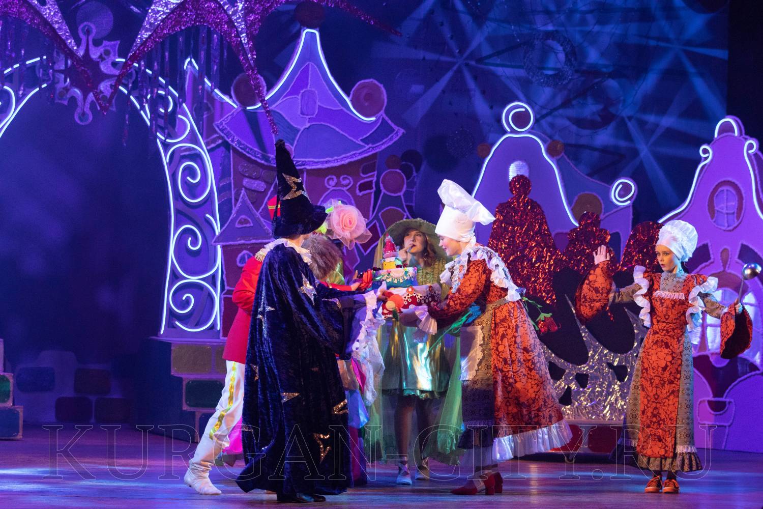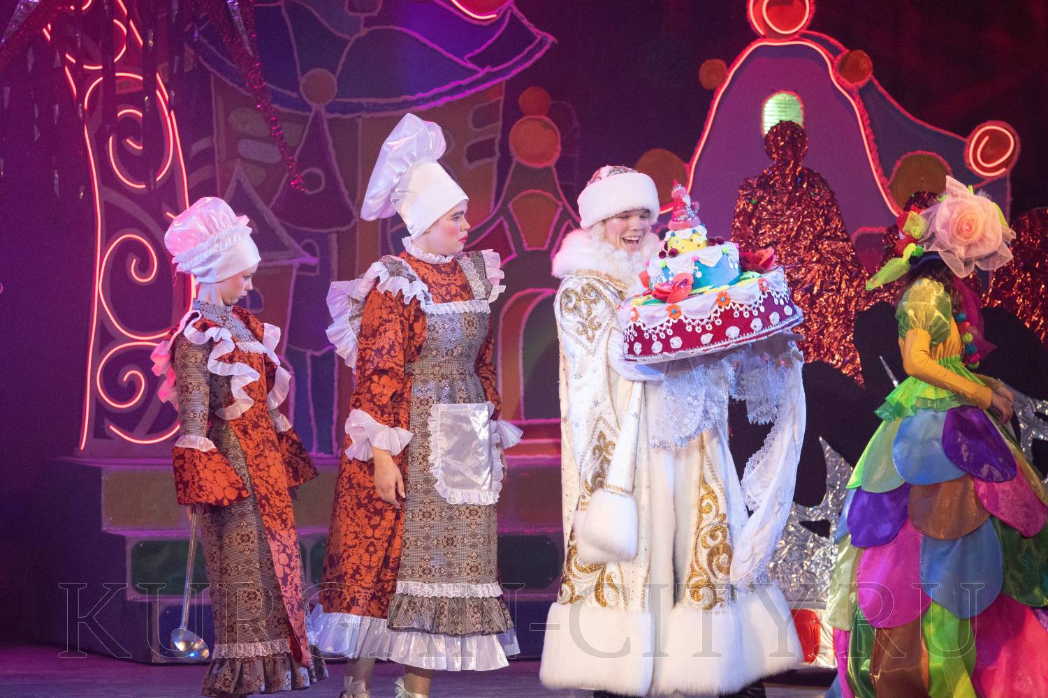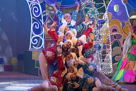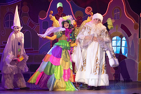 Начинается сказка с выступления Ансамбля народного танца «Улыбка» и встречи с Хитрюндием Великолепным. На сцене появляются звездочет, повара, бравый солдат и многие другие – все они хотят подарить подарки главному новогоднему волшебнику на его день рождения. Это торт, который никогда не съедается, звезда с неба, волшебный цветок. Но Хитрюндий Великолепный, превращаясь в Деда Мороза, забирает подарки и пытается всех перессорить. Яркие костюмы, сказочные декорации и прекрасные артисты, которые постоянно советуются с залом, делают сказку по-настоящему интересной и увлекательной.