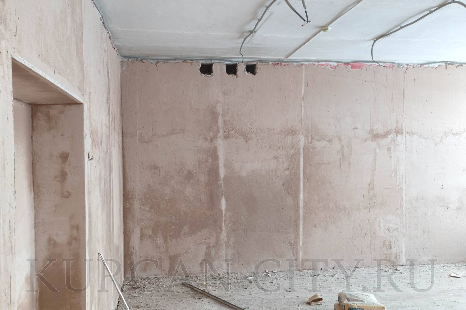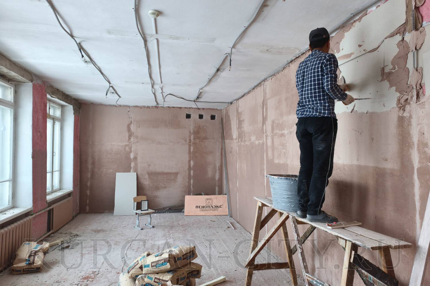 В настоящее время в школе продолжаются работы по монтажу системы электроснабжения. Ведется отделка на 1-ом этаже: рабочие отбивают старую штукатурку, снимают износившийся линолеум и доски, проводят оценку состояния деревянных балок и лаг. Штукатурные работы, разборка и кладка перегородок идут также и на 2-ом этаже.