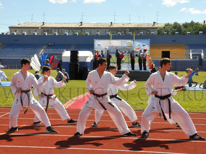 После того, как все поздравительные речи были сказаны, а награды вручены, спортсмены вышли на показательные выступления. Продолжили спортивную часть праздника участники легкоатлетической (шведской) эстафеты и забега на 100 метров с барьерами. Но и это еще не все. Любители командных видов спорта в этот день могли поболеть за участников всероссийских массовых соревнований по стрит-болу «Оранжевый мяч» и футбольного матча между командами ветеранов городов Кургана и Шадринска. Параллельно с матчем на специально оборудованной площадке осуществлялся официальный прием нормативов ВФСК ГТО.