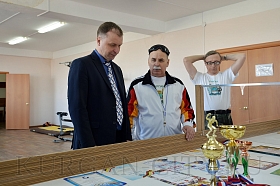 Встреча прошла в спортивном зале, в котором занимаются члены городского общества слепых. В зале установлены тренажеры и другое спортивное оборудование. Здесь также буквально на днях появился новый специальный стол для игры в шоудаун – настольный теннис для незрячих. Теннисный стол был приобретен на средства меценатов при содействии Руководителя Администрации города Кургана Андрея Потапова. Это специальный стол с бортиками, игра на котором идет на слух звуковым мячом - его катают по столу ракетками. Такая игра в теннис напоминает настольный хоккей. Спортсмены общества слепых уже имели возможность попробовать свои силы на новом оборудовании.