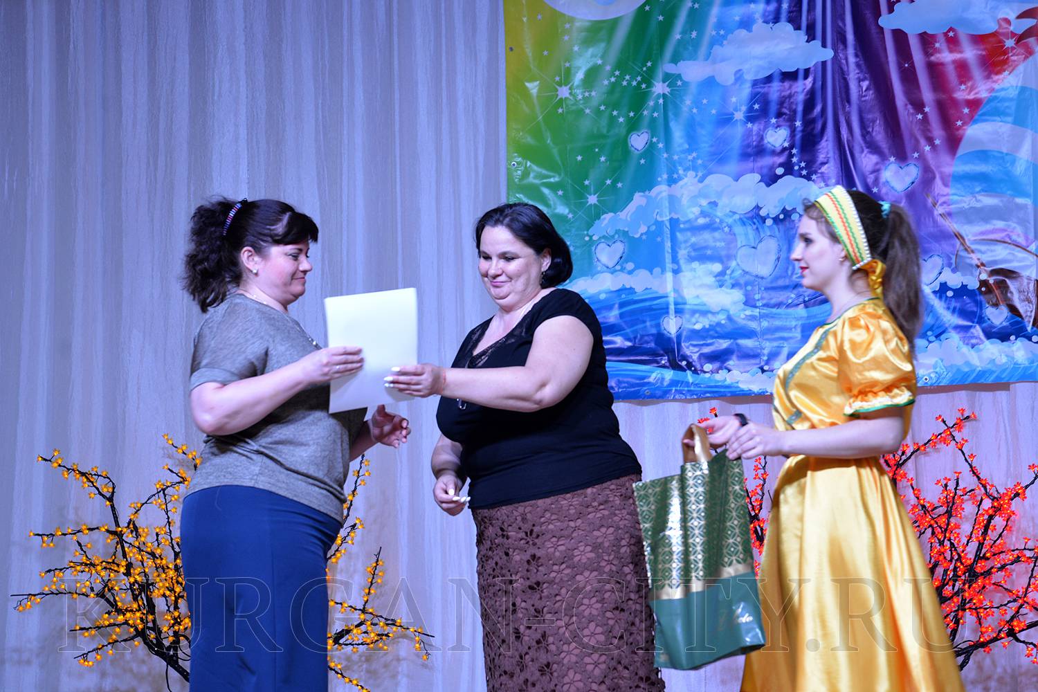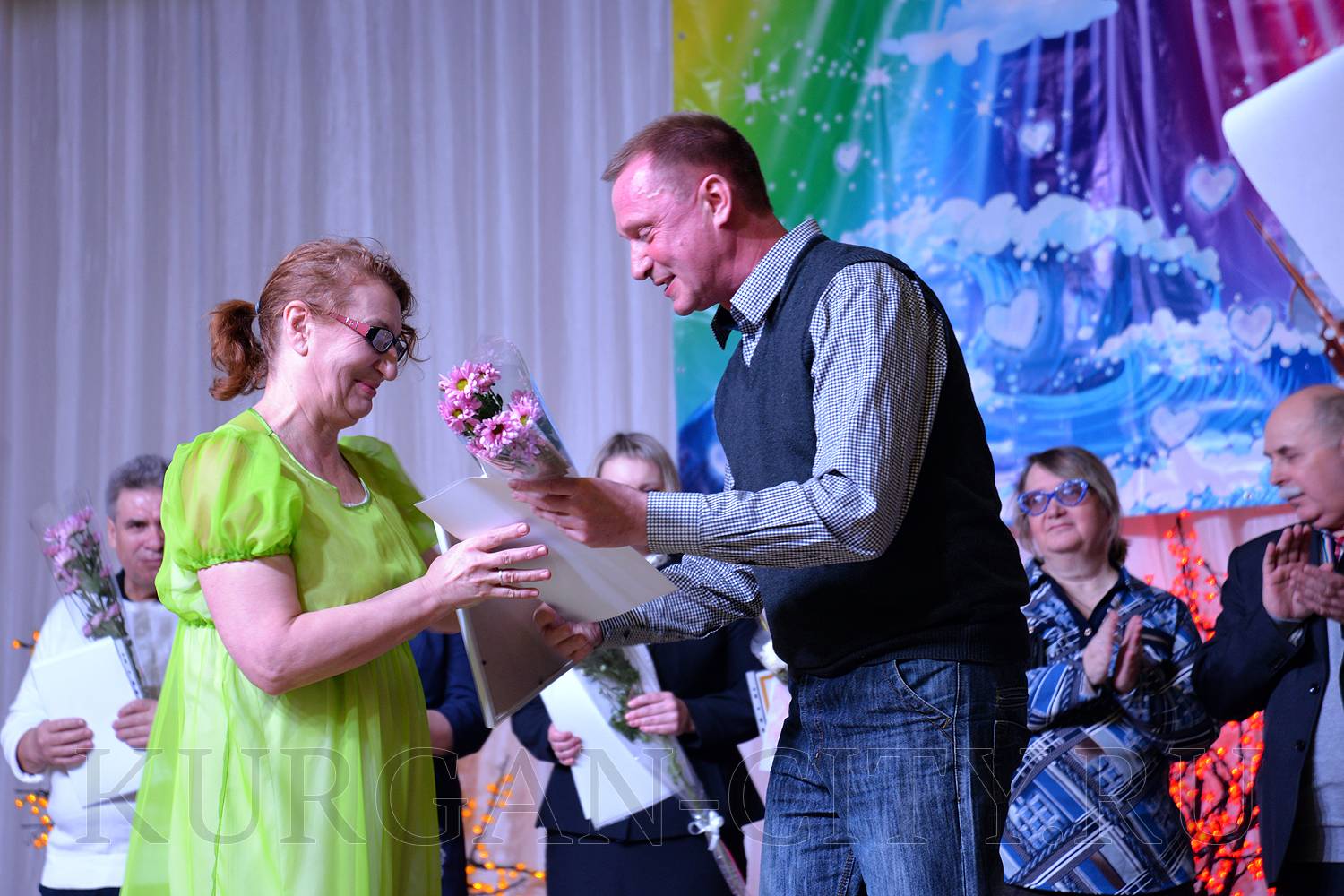 От лица учредителей фестиваля к его участникам обратился заместитель Руководителя Администрации города Кургана, директор Департамента социальной политики Игорь Постовалов. Он вручил Благодарственные письма руководителям общественных организаций и учреждений, которые из года в год принимают активное участие в фестивале. Игорь Владимирович поблагодарил руководителей за их способность объединять вокруг себя людей, которые могут творить и вкладывать в свои творческие номера и произведения душу. С ответным словом от участников фестиваля со сцены выступила председатель Курганской областной общественной организации спортивно-реабилитационного клуба инвалидов «Ахиллес» Вера Никитина. Она вручила директору МБУ «Городской Дом народного творчества» Алле Мирской Благодарственное письмо и отметила, что только совместными усилиями удается создавать общество людей с равными возможностями.