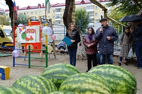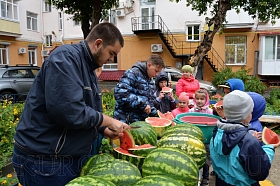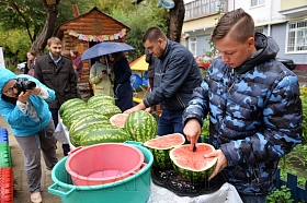 К празднованию «Дня арбуза», идея которого принадлежит самим жителям дома № 55, всегда присоединяются горожане из соседних дворов и других районов города. Такое событие собирает во дворе детей и взрослых, заряжая хорошим настроением, даже несмотря на ненастную погоду. В очередной раз праздник завершился поеданием главного угощения дня – спелых арбузов.