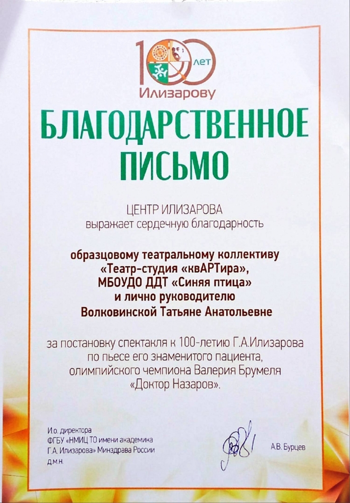 Театральная студия «квАРТира» Дома детского творчества «Синяя птица» поставила спектакль «Доктор Назаров», посвященный знаменательной памятной дате – 100-летию со дня рождения знаменитого курганского учёного, хирурга-ортопеда, академика Гавриила Абрамовича Илизарова.