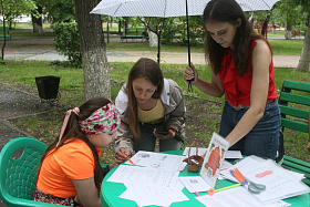Посетители Детского парка также могли принять участие в международной акции «Пушкин в городе». При помощи волонтеров – студенток-второкурсниц Курганского областного колледжа культуры Ани и Дианы – участники акции писали мелом на асфальте любимые строки из произведений А.С. Пушкина. А еще все желающие могли помочь воплотить смелый замысел – написать разноцветными мелками на аллеях Детского парка в одну длинную строчку «Сказку о золотом петушке», которой в этом году исполняется 190 лет. «Создадим ожерелье сказочных пушкинских слов, а потом измерим длину этого замечательного произведения в метрах!» – улыбались волонтеры.
