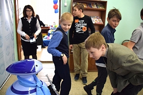 Кульминацией мероприятия стала презентация робота – промоутера чтения, который приобретен на средства президентского гранта в рамках проекта «Школа для настоящих мужчин». Дружелюбный робот станет полноправным сотрудником библиотеки им. А.С. Пушкина: будет встречать читателей, рассказывать о книжных новинках, провожать гостей к месту выдачи литературы. Приветливый собеседник, он не только поддержит беседу, но и может послать воздушный поцелуй. Во время праздника ребятам было предложено придумать имя для нового друга. Свои варианты можно размещать в группе «Школа для настоящих мужчин» в социальной сети «ВКонтакте».