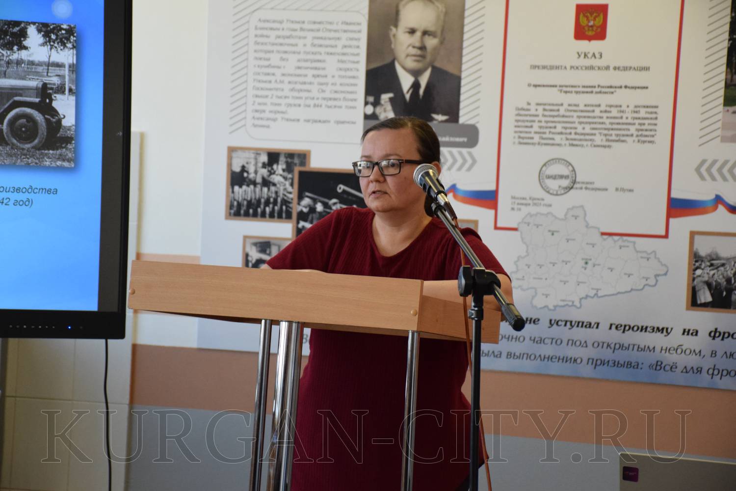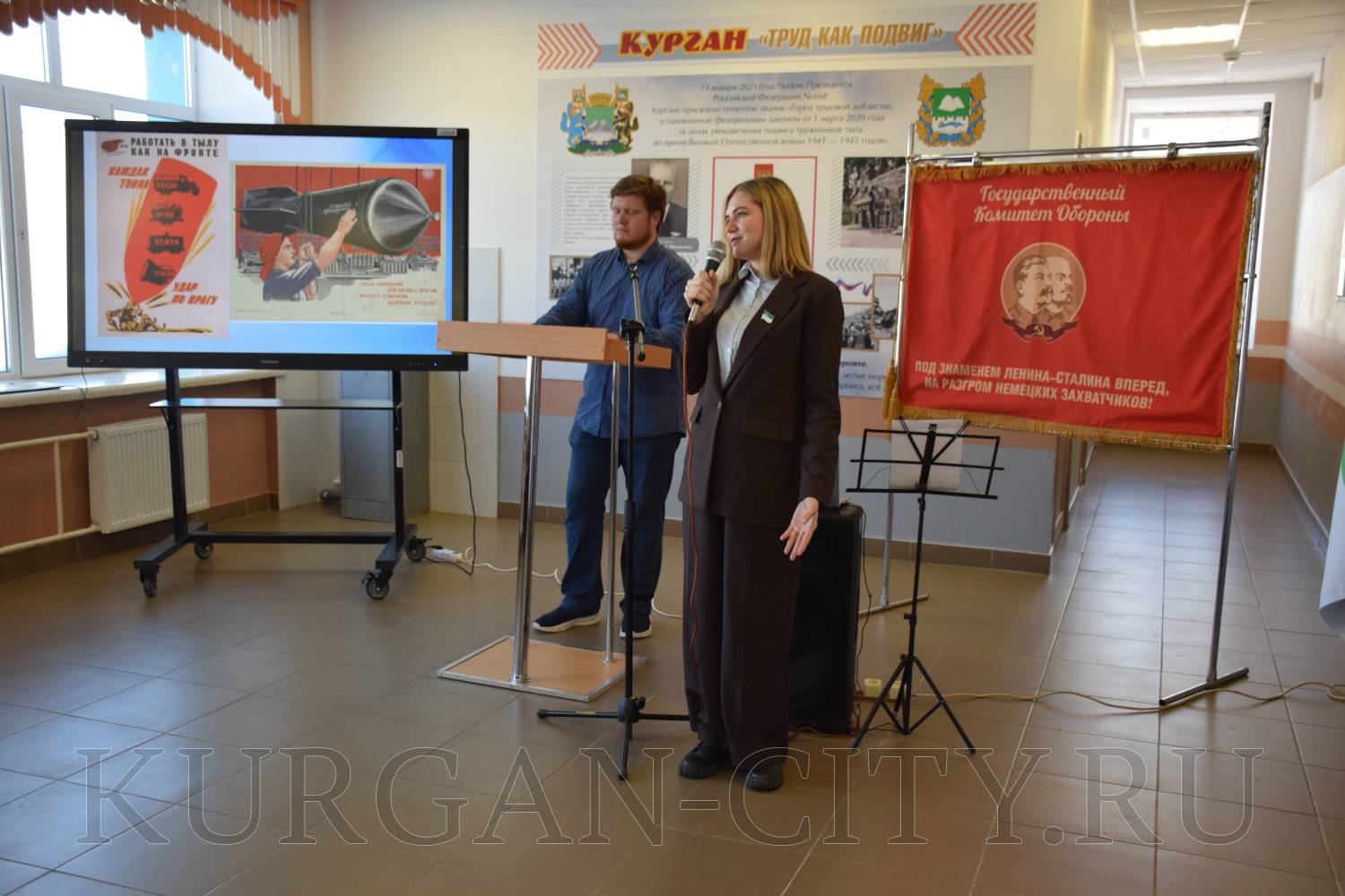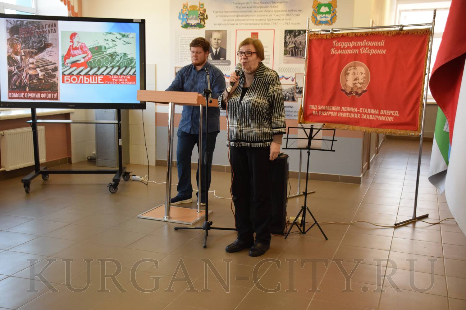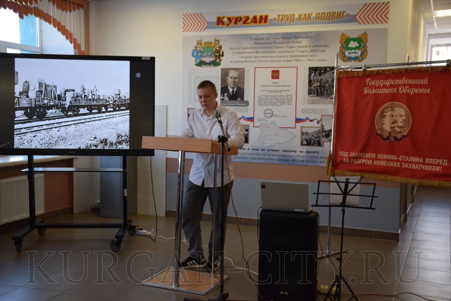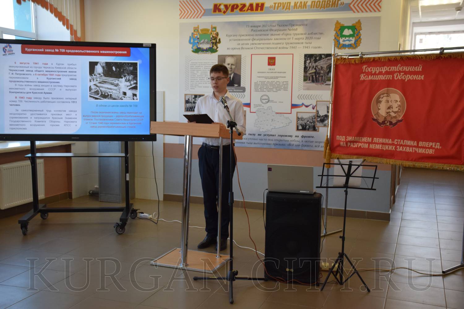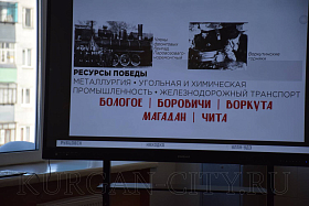 Было отмечено, что в суровые военные годы маленький зауральский город превратился в мощный промышленный центр. Сюда были эвакуированы 22 предприятия и около 20 тысяч рабочих из разных уголков страны. Объём промышленного производства возрос в полтора раза, а машиностроения и металлообработки – в 3,7 раза. Женщины, старики и подростки у станков под девизом «Линия фронта проходит возле твоего станка! Ни шагу назад!» выпускали патроны, снаряды, огнемёты, танковые огнетушители, бензозаправщики и многое другое, необходимое фронту.