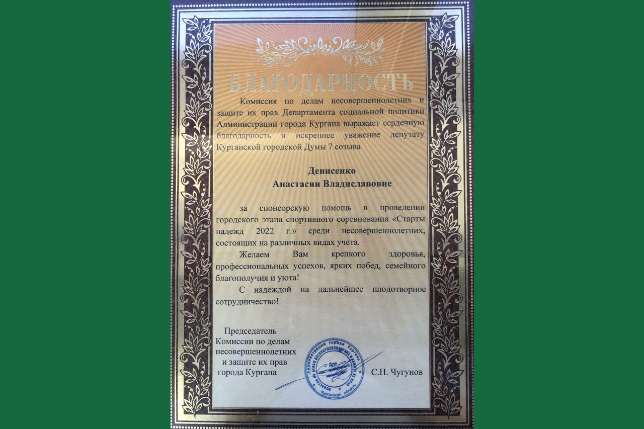 Председателю постоянной депутатской комиссии по экономической политике, предпринимательству и собственности Курганской городской Думы Анастасии Романович вручено Благодарственное письмо от Департамента социальной политики Администрации города Кургана.